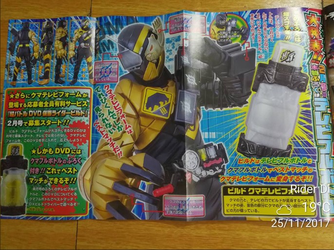 RabbitTank Sparkling, PhoenixRobo, BearTV and "random" stuff. If someone has X-Ray vision. On the left of the PhoenixRobo pic, it seems Build forms cards are depicted (like the one Katsuragi show in one of the episodes). I think it's the Build forms who will appear in the movie. I seem to recognize : PhoenixRobo RabbitTank (Sparkling ?) a Grey/Dark one that look a bit like SmaphoWolf (but not convinced) and "?" Does someone see better than me ? ^^" |