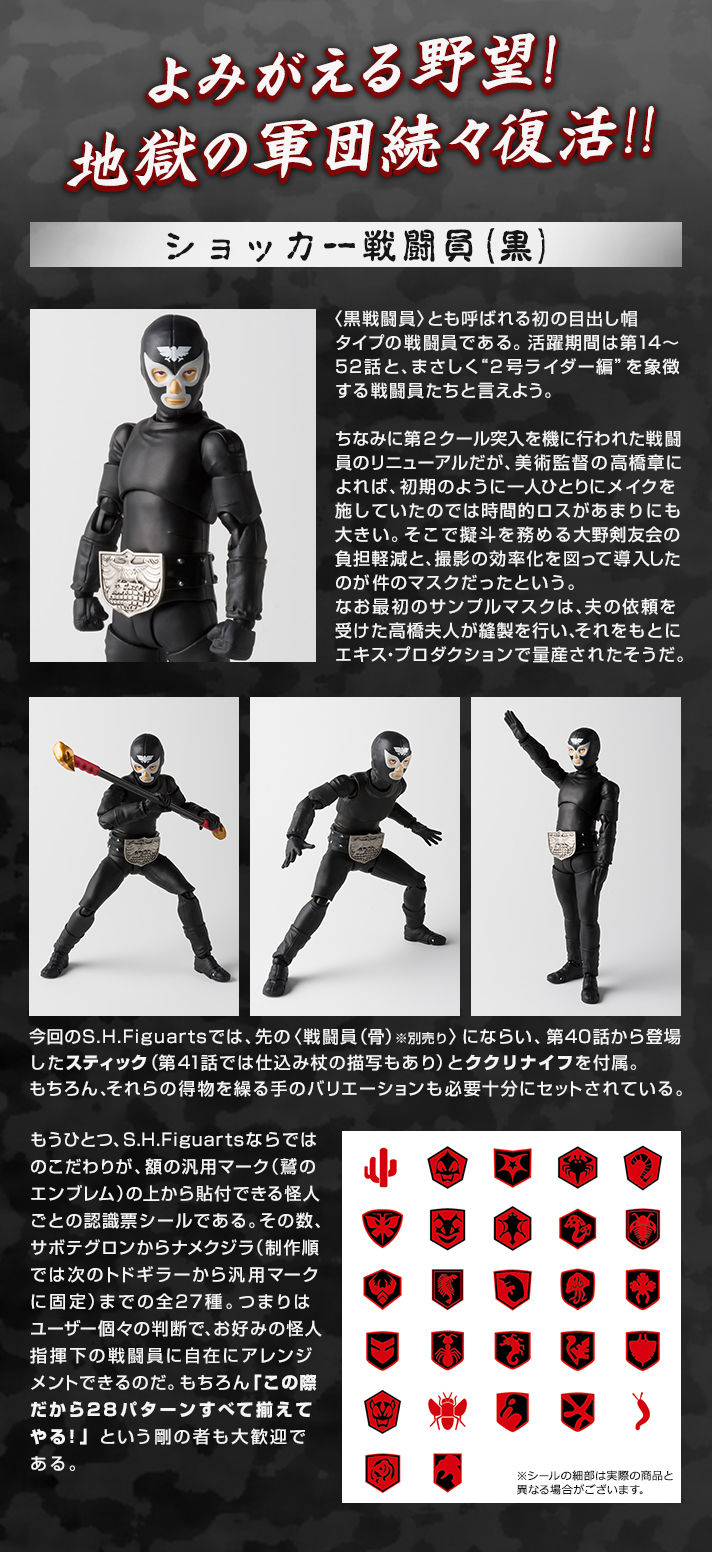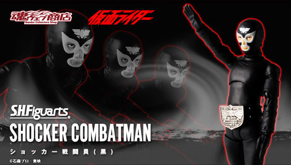 Tamashii Web Exclusive July 2018 5400 yen For anyone unfamiliar with this variant of Combatman, it's of a variety that did not feature the traditional "Shocker ribs" on the costume. Admittedly a less common variety, this isn't the first time Tamashii Nations has done a figuart of them. The old Combatman mold was also redecoed into it several years back. This release also goes a bit further by including a full 28 Shocker Insignia's of the various Kaijin and comes with the Shocker Baton/Staff.
