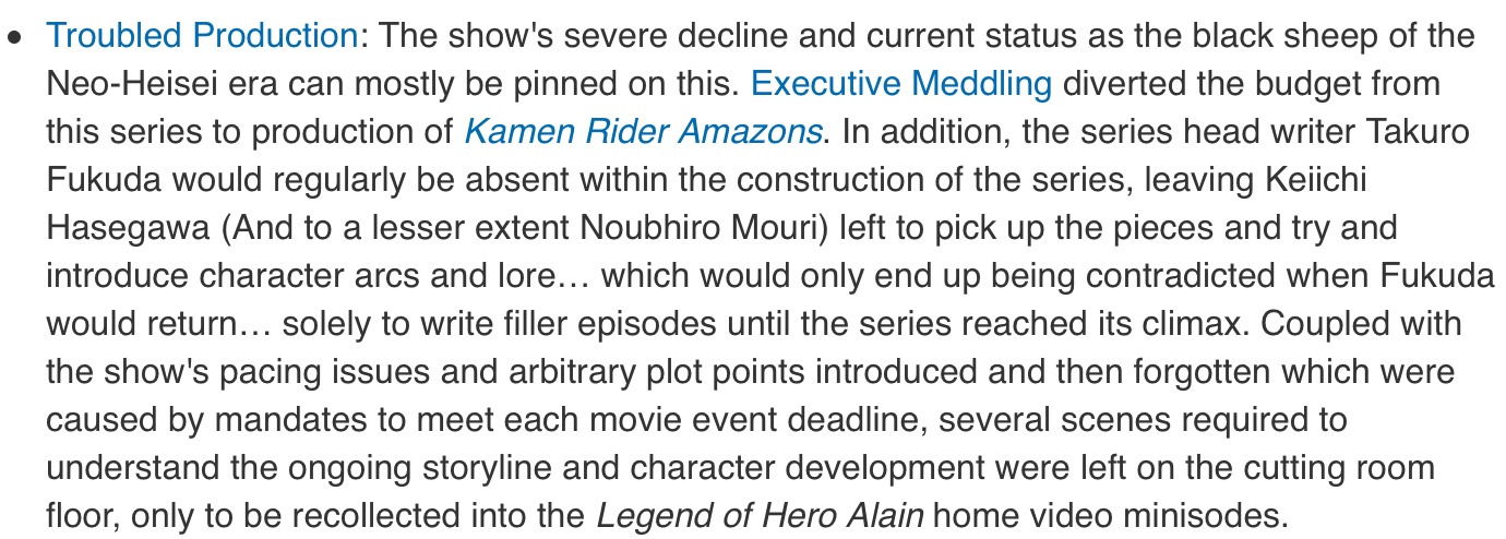I took a picture and click on the thumbnail to look more detail about the troubled production of Kamen Rider Ghost. If you didn’t click the thumbnail...... Here’s we go The show's severe decline and current status as the black sheep of the Neo-Heisei era can mostly be pinned on this. Executive Meddling diverted the budget from this series to production of Kamen Rider Amazons. In addition, the series head writer Takuro Fukuda would regularly be absent within the construction of the series, leaving Keiichi Hasegawa (And to a lesser extent Noubhiro Mouri) left to pick up the pieces and try and introduce character arcs and lore… which would only end up being contradicted when Fukuda would return… solely to write filler episodes until the series reached its climax. Coupled with the show's pacing issues and arbitrary plot points introduced and then forgotten which were caused by mandates to meet each movie event deadline, several scenes required to understand the ongoing storyline and character development were left on the cutting room floor, only to be recollected into the Legend of Hero Alain home video minisodes. Last edited by vin13ish; 06-12-2018 at 06:59 PM.. |