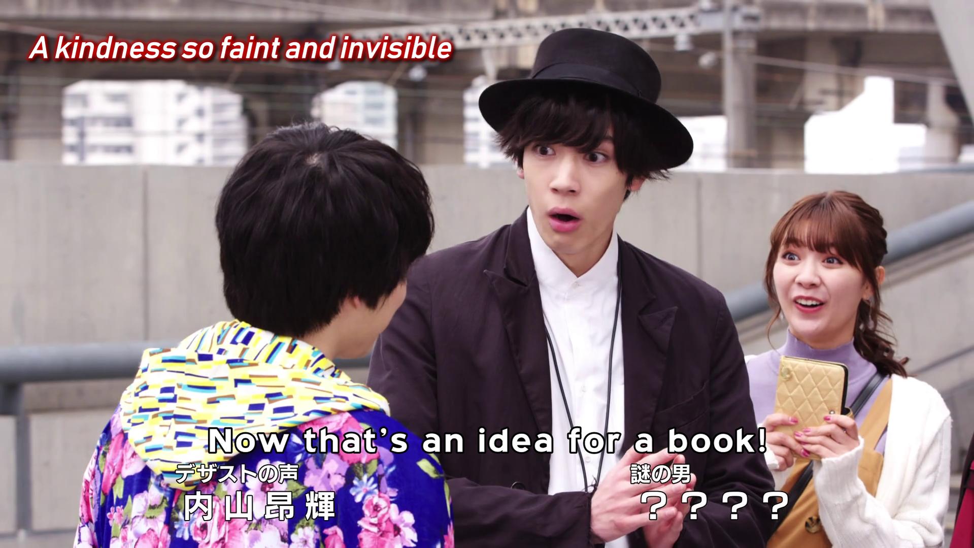 On the Ghost side, since of course this is also a crossover with my fourth favorite Heisei Rider show so I feel obliged to mention something about it, I thought it was great just to see Takeru and the gang again and Jabel trying to reason with Desast like how Onari did to him, even though it didn't work here. He probably just needs to train some more to get on Onari's level. I like how Takeru acted as a sempai Rider to Touma as well as declaring himself a fan of his book, they get along real tight as people who appreciate the wonder in the world and the stories of people who give them inspiration. Looks like my speculation about Danton's followers was correct. They're using Kanon to get to Makoto. He's the key to recreating the ultimate lifeform. I'm excited to see where the post-credits scene leads!