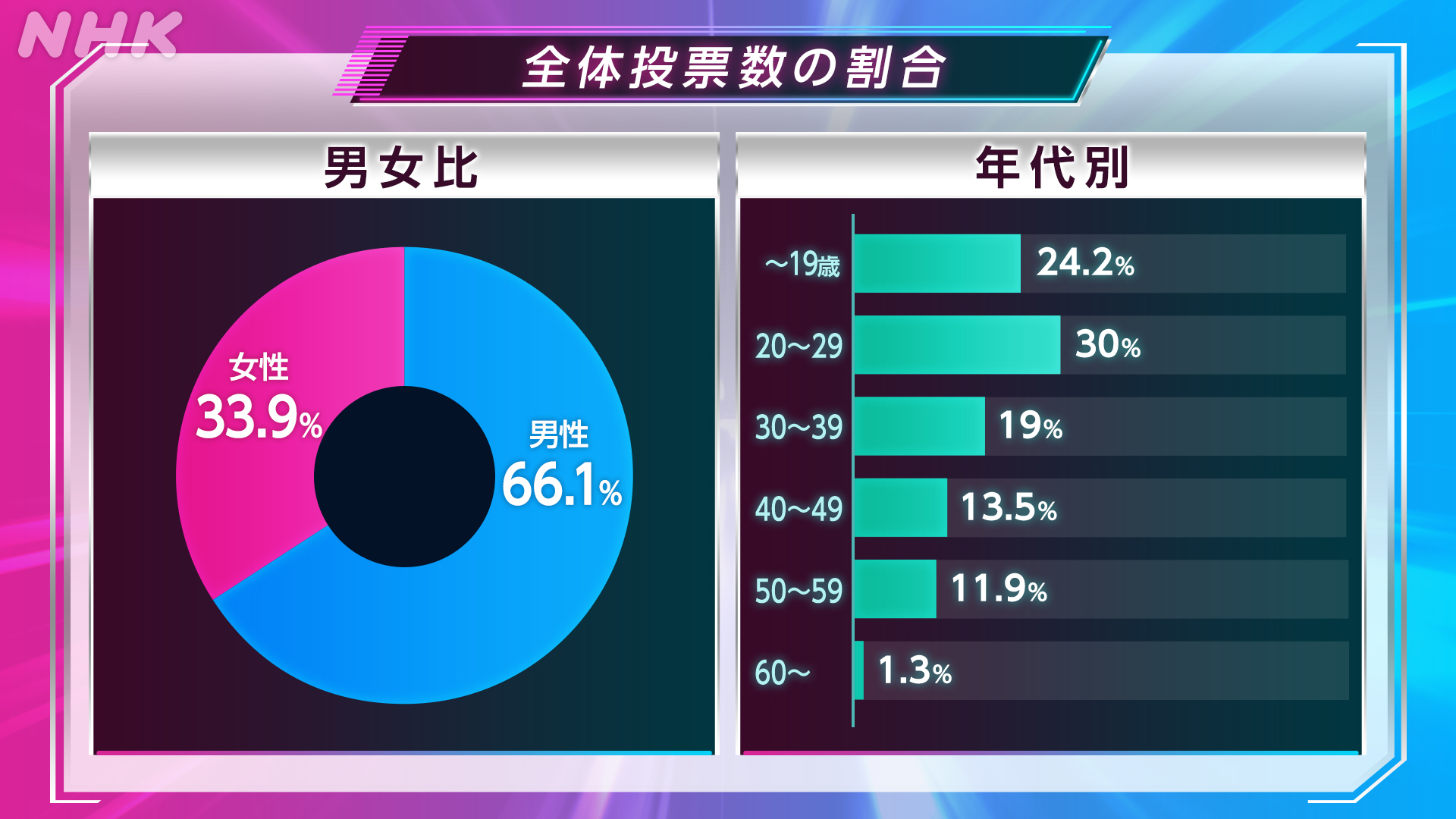 Commemorating the franchise's 50th anniversary, the TV channel NHK has hosted the largest ever Kamen Rider poll among Japanese fans; asking them for their favourite productions (TV series, Movies), their favourite Kamen Riders, and their favourite music. The poll in the end consisted of a total of 567,710 votes; with demographics split by gender and age group in the image below. Most notably, Women make up 1/3 of the vote and those in their 20s were the most represented age group
