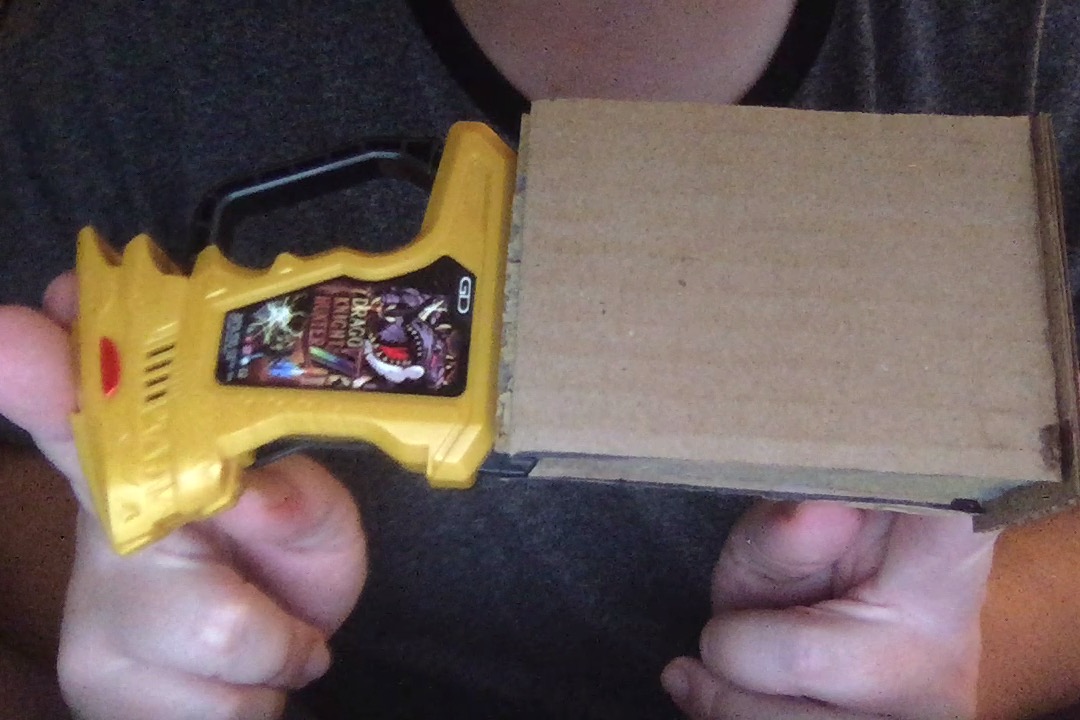 So I recently managed to procure a couple of DX Gashats and realized I had no means to display them. So I spent a few nights figuring out what I had on-hand and what would make for a good, secure holder to slide them into. Finding that most places that sold such items (not many at all, sadly) had them laying on their side, I was gonna give up...until I dug through my old sanding kit and found a very used up Sanding Sponge! So I took it out, cut it in half, measured the dimensions as best I could manage to make the interior fit well with the Gashat length and width, used an Exacto-Knife to cut and hallow the interior a bit, took three pieces of cardboard and put one on each tall side and one on the bottom to act as a base. After insertion and being scared half to death by having the word "FANG!!!" yelled at me, I also cut in a notch for the activation button so that would not happen again. LOL So here are some images of my prototype Gashat Holder/Holster. Will be looking to vastly improve on the overall design and maybe provide a proper tutorial later on in the year. But if in the end, even this helps inspire you all and ideas of how YOU wanna make them look should happen, AWESOME! I'd love to see them! |