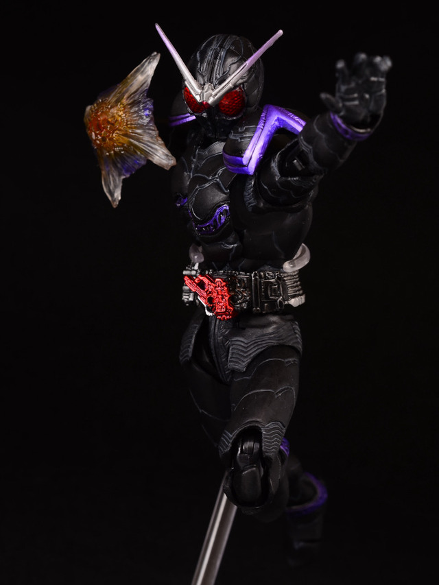 This stand alone form of W's Joker half made it’s first appearance in the Kamen Rider W Forever A To Z the Gaia Memories of Fate movie, and the final episode of the series. It appeared again later in the OOOs and Fourze Megamax film. The figure includes two effect parts to replicate his Rider Punch and Rider Kick Maximum Drive attacks, and a set of hands for various different display options. |