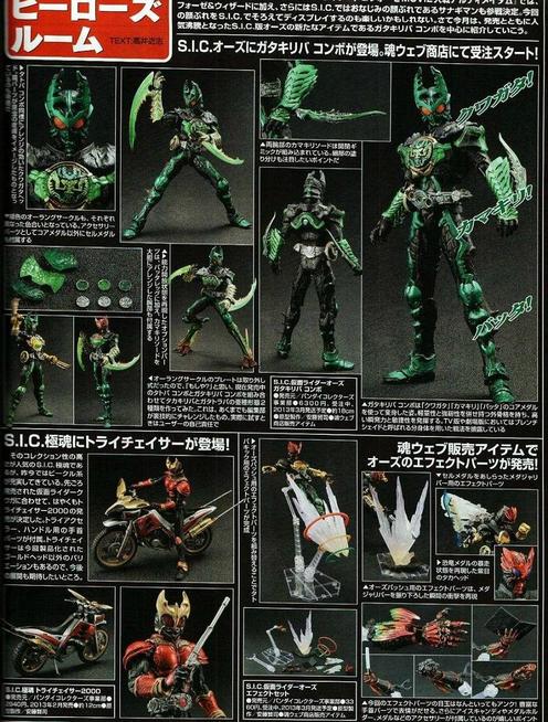 Also revealed in this new scan are an Effects Part Set for SIC TaToBa- Web Exclusive Release in March for 3360 yen And last but not least a recreation of Kuuga's TryChaser motorcycle in Kiwami Tamshii scale- to be released at retail in February for 2800 Yen Original scans located HERE! |