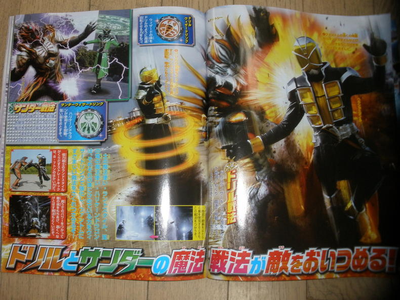 Following todays info on Gokaiger Vs. Go-Buster come magazine scans for upcoming Tokumei Sentai Go-Buster and Kamen Rider Wizard episodes! In todays scans, courtesy of Toku Insider, we get our first glimpse of Wizards' Hurricane Dragon Style and his special Thunder Ring. Also featured are a few pages noting all of Wizards' rings so far and their abilities as well as a few pages focusing on Movie Wars Ultimatum!
