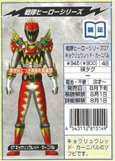 AND we have our first look at Pleson's combination with Gabutyra and Bunpachy, Bakuretsu Kyoryuzin! This combo features an almost centaur like appearance with Gabutyra's torso pointed forward (as in T-Rex mode) and Pleson riding atop him. Bunpachy makes up the left arm while the forward section of Pleson's vehicle mode makes up the right. Truly an awesome and interesting combination to behold! Credit to Tokunation user Denshin48! Edit: And thanks to DrillBit, we have an image of KyoryuRed's upgrade form, KyoryuRed Carnival!