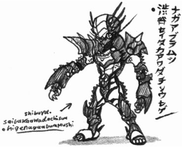Here are the first two monsters of Hikonin Sentai Akibaranger. Shibuya Seitakaawadachisōhigenagaaburamushi & Shibuya Kōzorinahigenagaaburamushi.