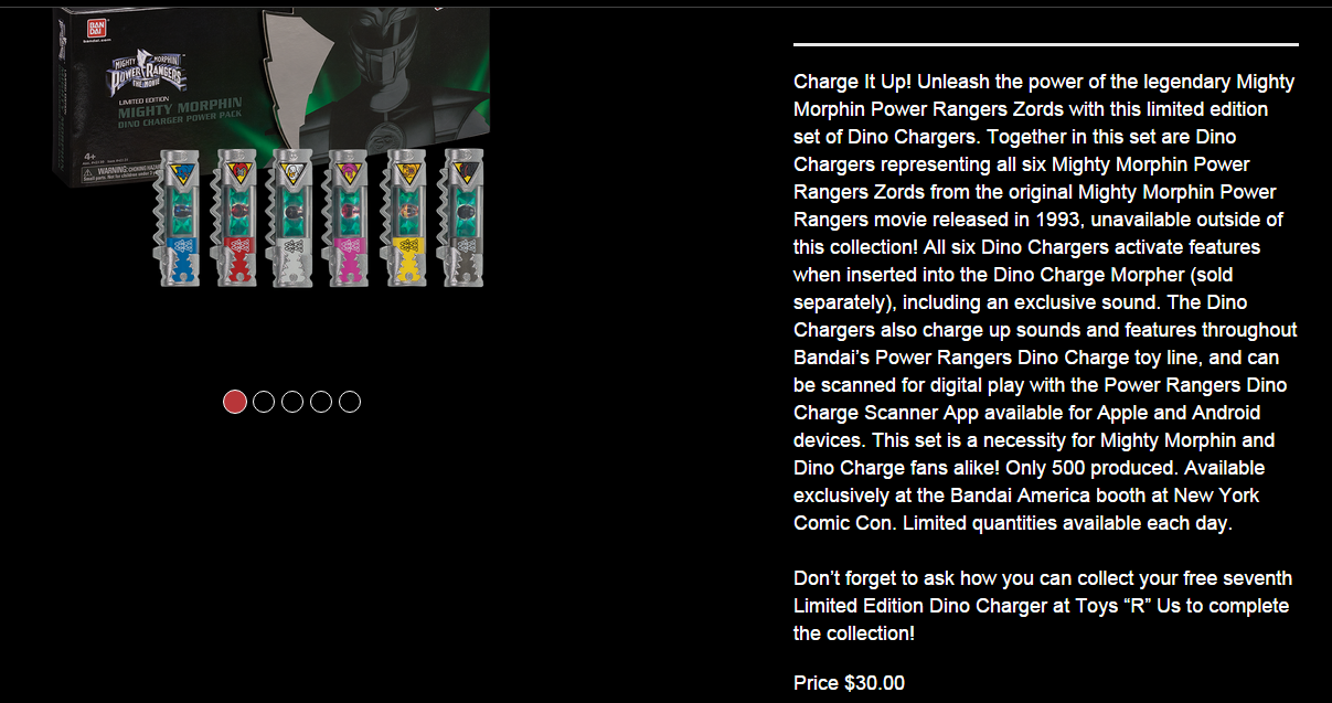 MMPR The Movie Dino Charger 6-Pack $30 (Ninja Megazord Charger is a TRU exclusive for this fall) Legacy Power Morpher Reissue - $60 (straight up reissue, no differences to the retail release)