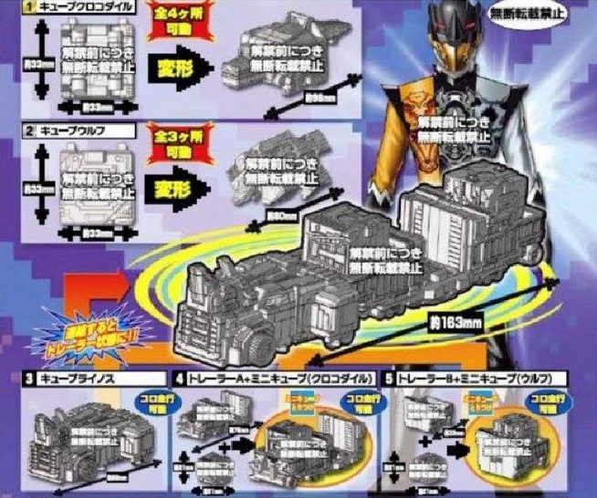 Cu-be or not cu-be, that is the question. But I'm not positive the Rhino has a cube mode. It's boxy, and can carry the alligator and the wolf, but looking at the images seem to place the machine in three distinct parts, a cab and two trailers. None of the pictures display an actual transforming feature, just intractability between them and Cubes Wolf and Gator.