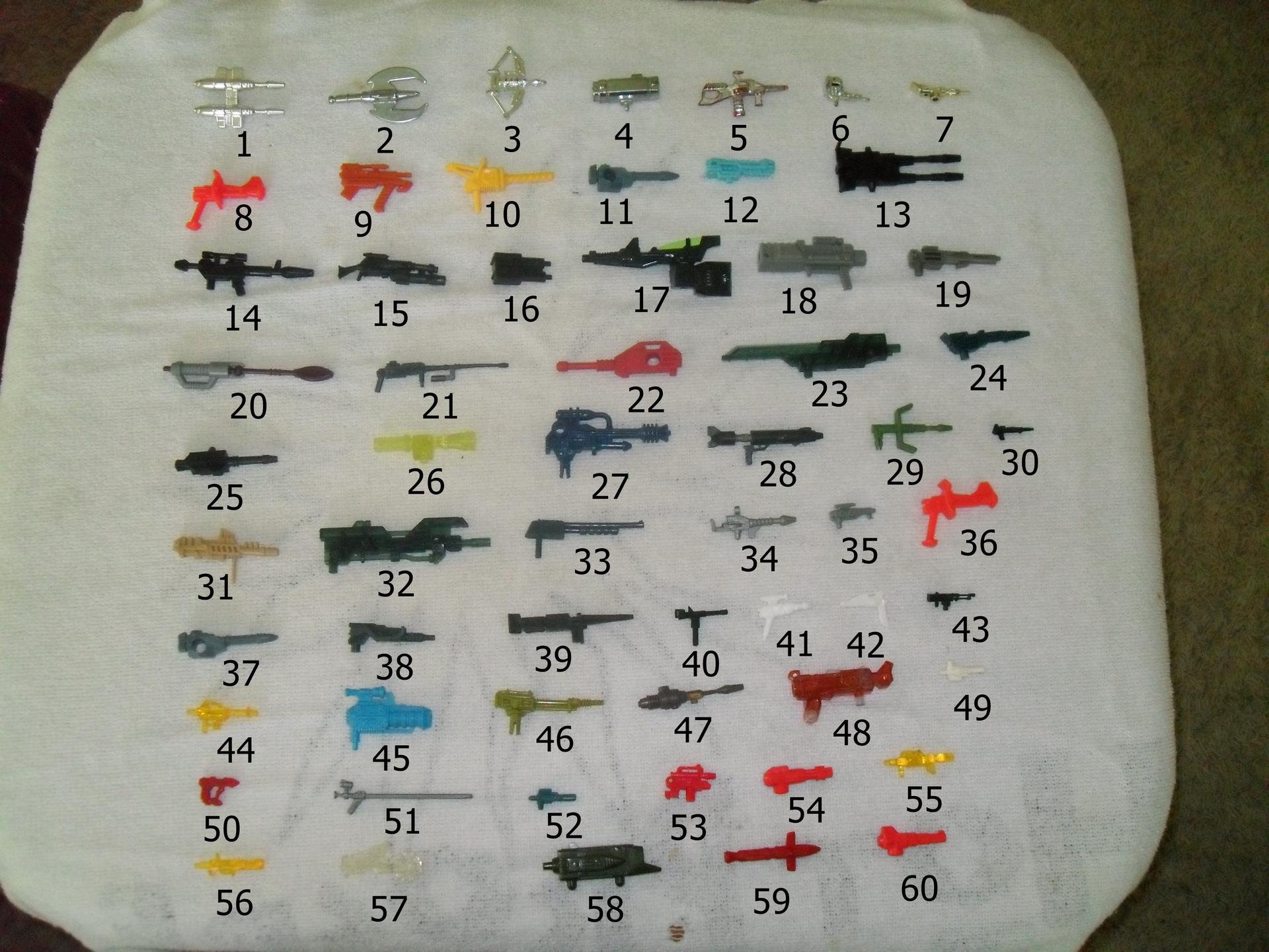 2 3 4 Toybiz War Machine missile launcher 5 6 7 8 gun from Man e faces from 80's masters of the universe line. 9 C.O.P.S. Sgt. Mace pistol 10 11 GI Joe Skystorm Copter. 12 13 Buzz Boar (I think) 14 15 16 17 18 19 20 21 Roadblock's weapon, might be from an accessory pack. 22 Cobra Sea Ray 23 24 25 26 27 Wheeled Warriors 28 Robotech/Macross Valkyrie rifle - Veritech gunpod 29 Battle Force 2000 Eliminator Jeep 30 31 Captain Power - Lt. Tank Ellis (for certain) 32 33 34 35 36 37 GI Joe Skystorm Copter 38 39 40 41 GI Joe Snow Serpent V2 42 Mighty Morphin' Powers Rangers pistol 43 Gobots Geeper Creeper 44 45 46 47 48 49 50 Exosquad Neosapien pistol 51 GI Joe Snake Eyes V3 52 53 54 55 56 57 58 59 GI Joe Cobra Mamba 60 |