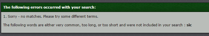 But when i use the advanced search it tells me that SIC or S.I.C. is too short and excludes that from the searching. I know both SIC and S.I.C. are used in the sales thread because I've seen them. How do I get around this? Or what's the short hand (long hand) that's most commonly used on this site for it? Last edited by MechanovaKing; 07-02-2016 at 09:27 PM.. |
