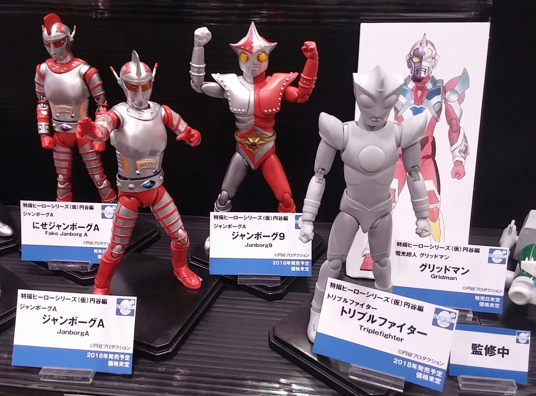 The figures revealed were: Spectreman Silver Kamen Zone Fighter Fireman Redman Mirrorman Janborg A Jan-Nine Fake Janborg Triple Fighter Along with concept art of Gridman. Some of these figures will be released around December 2017, with others not having a fixed month.