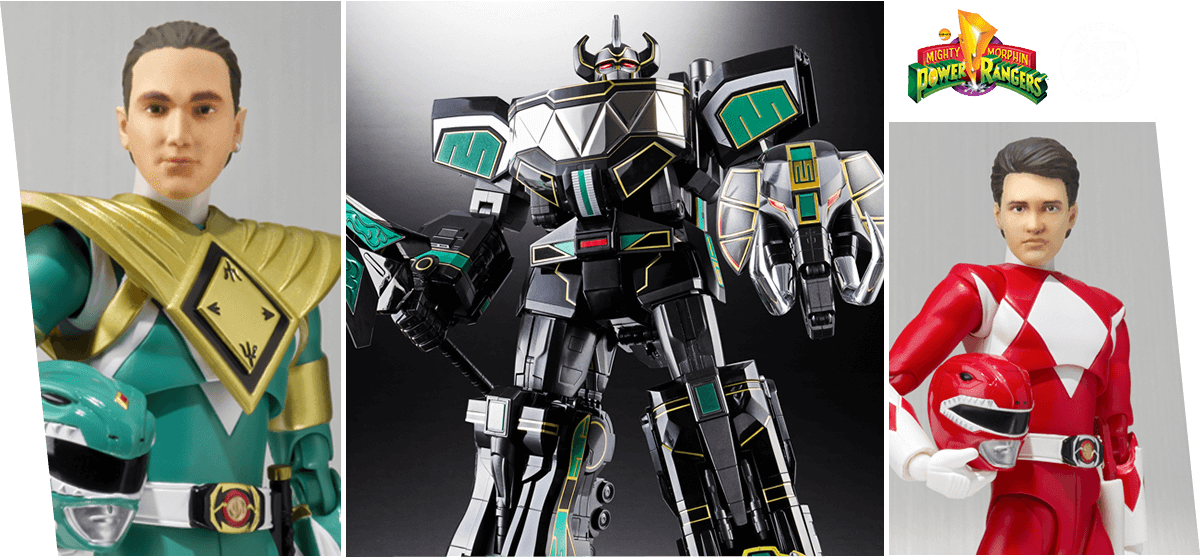 The USA-version of the Tamashii Nations website has reopened after renovation, bringing us a new reveal: A black repaint of the amazing Soul of Chogokin Megazord (Daizyujin). Also pictured are the new releases of the Red Ranger and Green Ranger Figuarts with brand-new, unmasked heads which were revealed at Toy Fair this year.