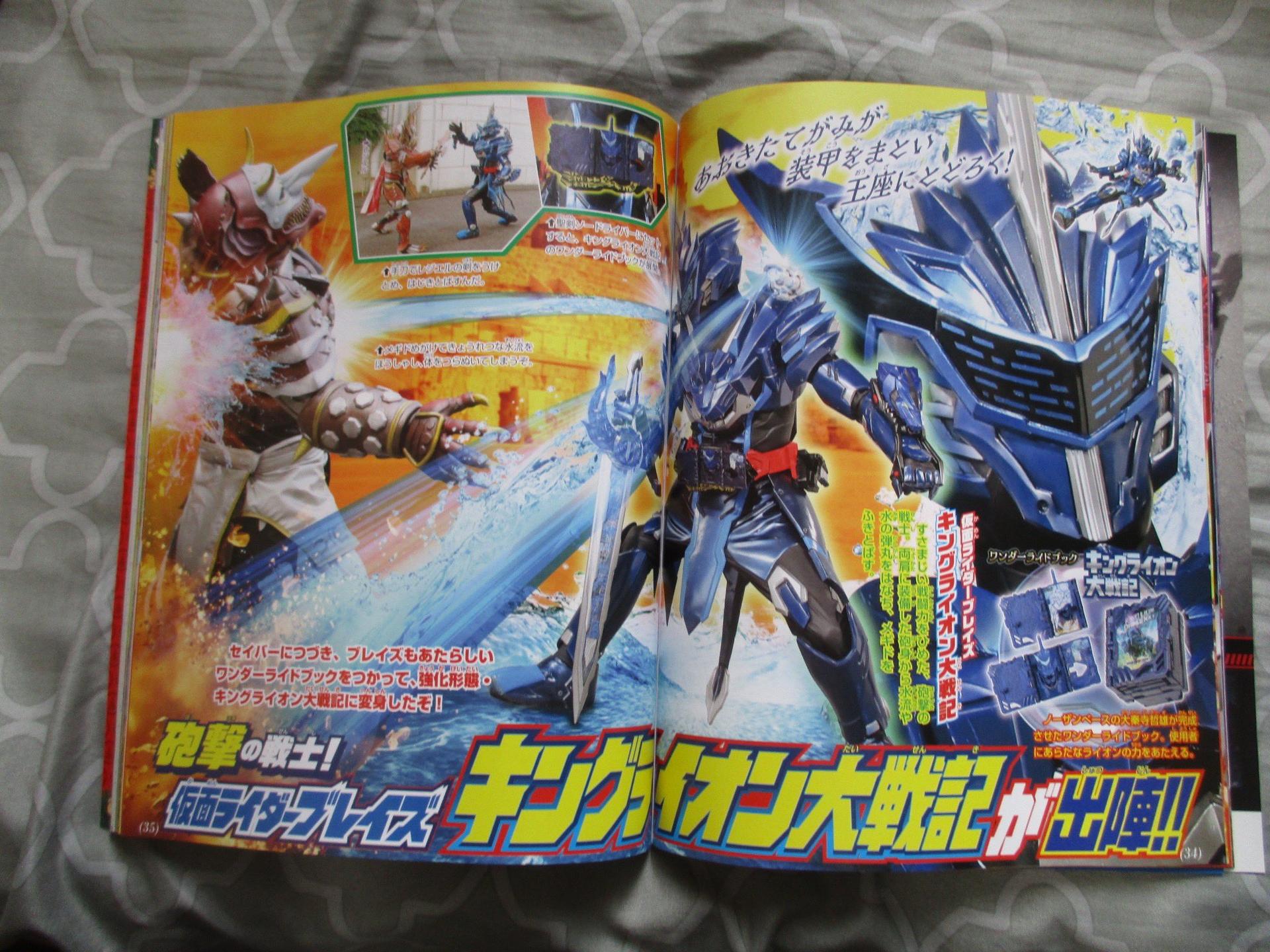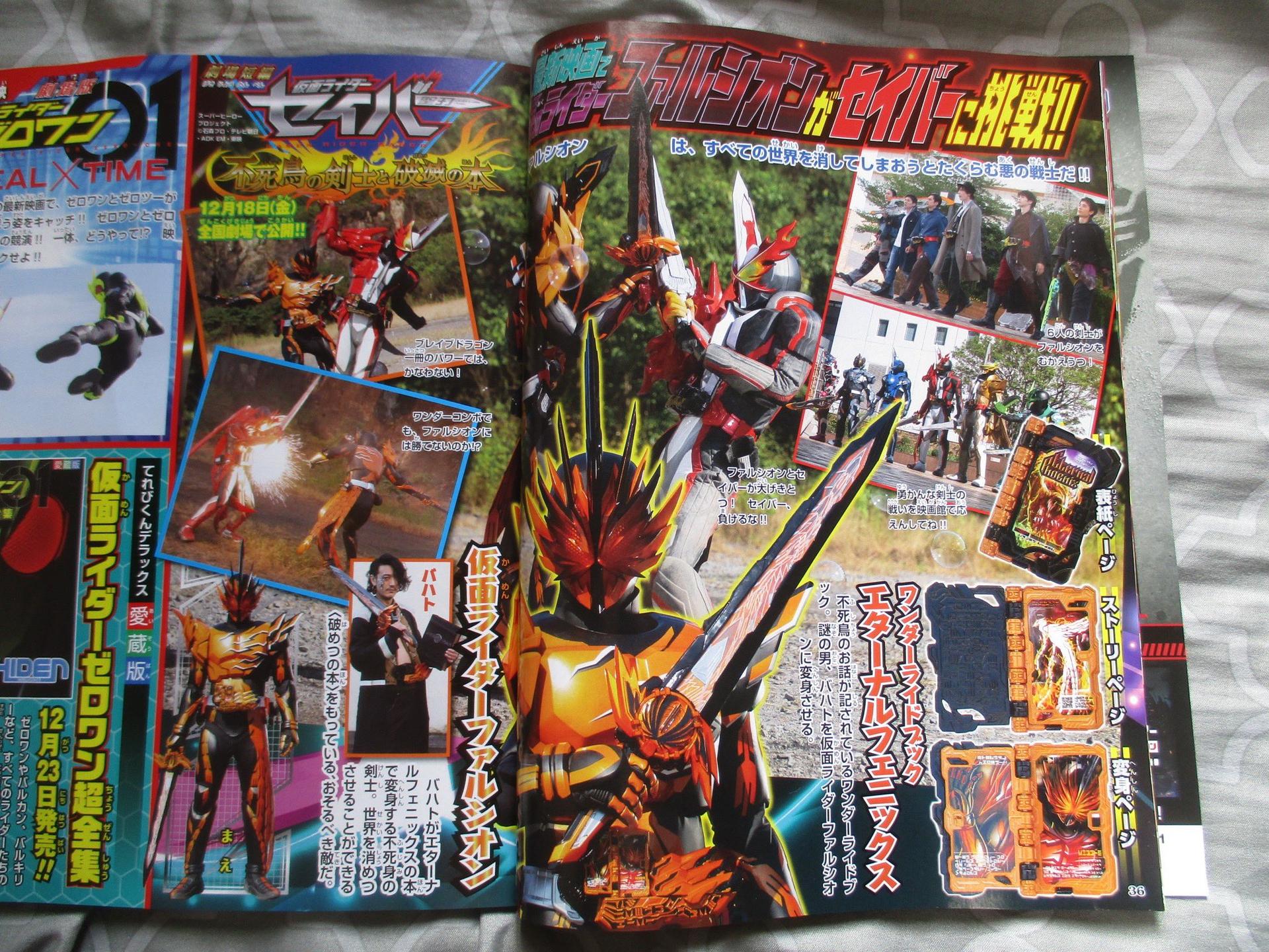- Tetsuo successfully creates a united WRB, Dragonic Knight for Saber and King Lion Daisenki for Blades. They are more powerful than the three-volume combos. By using these books Saber becomes Kamen Rider Saber Dragonic Knight, and Blades becomes Kamen Rider Blades King Lion Daisenki - Saber Dragonic Knight's finisher is the Shinka Ryuhazan, which can be translated into something in the line of Divine Fire Dragonic Breaking Slash, where Saber riders a gigantic dragon and the Kaenken Rekka's blade grows to slice enemies in two -Blades King Lion Daisenki's finisher is the Lionel Hydro Stream - The Dragonic Booster is a gauntlet-type item, and scanning the books with it allows Saber to use the book's power, Blades gets the King Lion Booster instead - Blades's new form also allows him to transform into an animal form called King Lion Beast <Movie Rider Kamen Rider Falchion> -Falchion is Bahato, a fencer who is in possession of the Eternal Phoenix WRB and the Book Of Destruction. The scan says Touma rushed in and saved Kento but, who knows. It could be one of those he saved him but too late situation. Last edited by Sunred; 11-25-2020 at 04:38 AM.. |