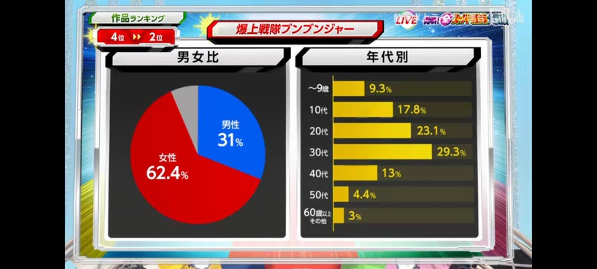 There were some statistics shown during the live show were the top results were announced. For the overall voting, it's about a 40% to 50% split between female and male voters, with the largest demographic being those in their 20s and 30s. For individual show statistics, we have some for ToQger and Boonboomger, where both had a larger percentage of female voters, with ToQger demographic trending towards those in their teens (so likely kids who watched ToQger in their youth) and Boonboomger demographic trending towards those in their 30s.