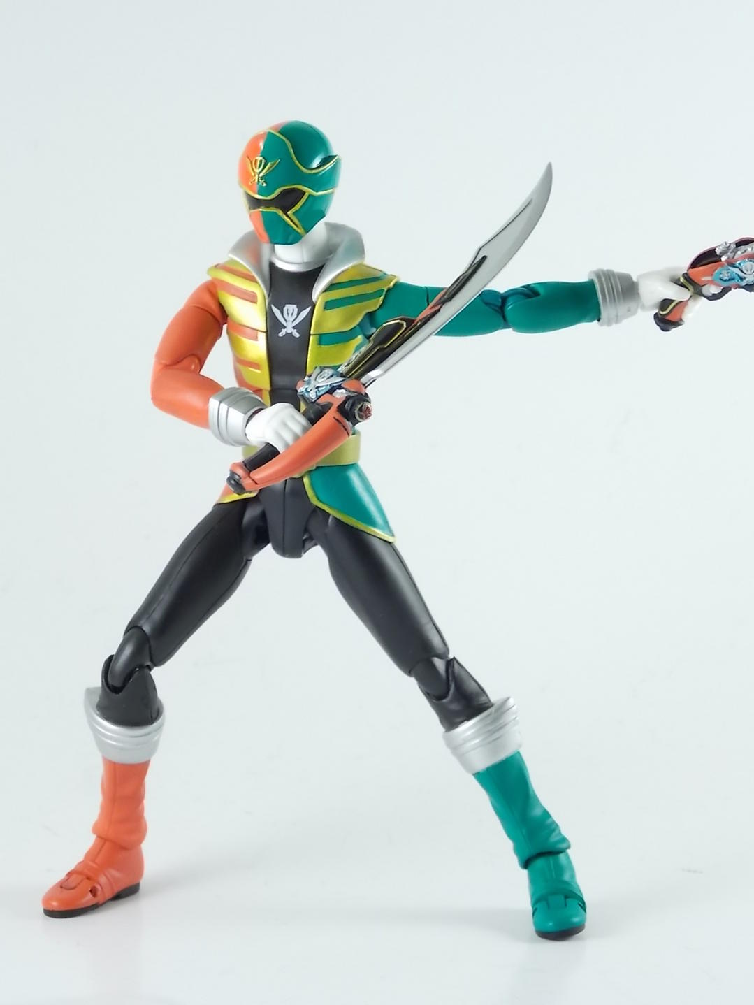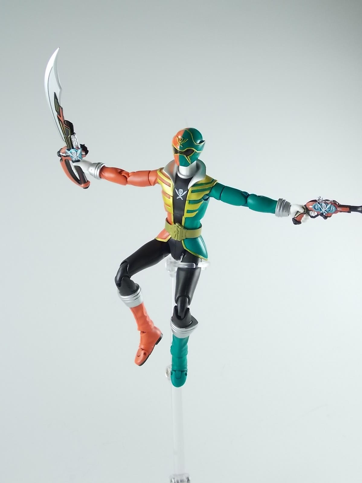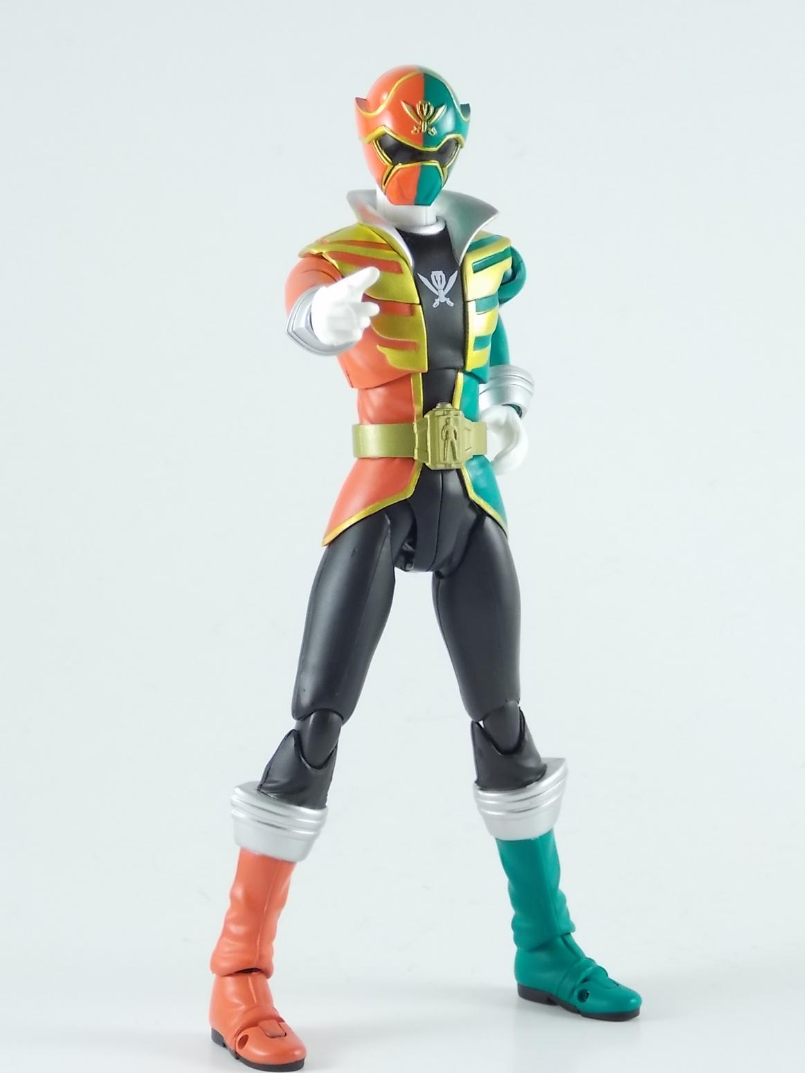 I still love how the helmet has both visor shapes on their respective color sides. Toei could've just used a red or green helmet that was specially colored and I don't think anyone would've batted an eye, but that little touch of detail makes the show version, and this version really nice I think.