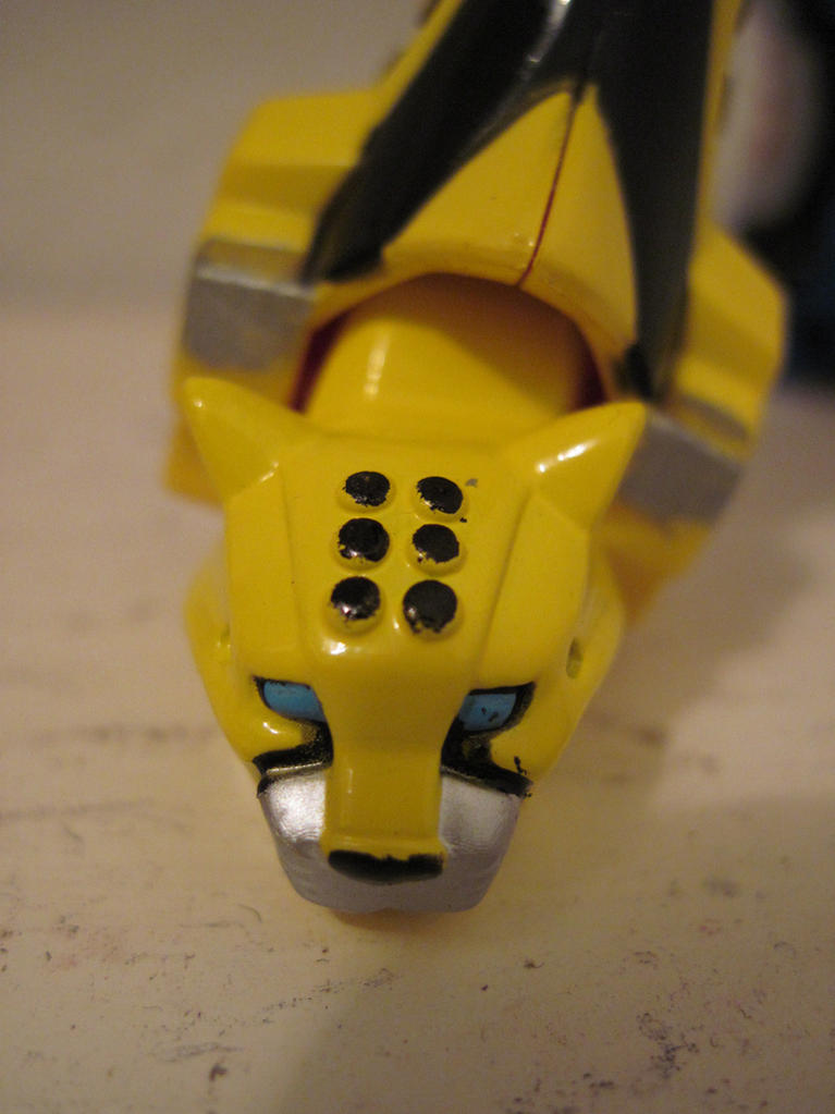 I've been a Super Sentai fan for several years now and I don't have any merchandise from it. The real stuff is a bit too pricey, so I looked to the Power Rangers stuff. I rather liked the idea of the retrofire series. I looked at some reviews and the Jungle Pride megazord seemed to be the best figure currently available. I thought the articulation was pretty cool, totaling 18 points. But the paint scheme seemed too simple. So I added all the details to make it show accurate. I added: - blue paint on the GekiTiger's eyes as well as the black trim around it going up to the ears. - Changed the black on the outside of the face to silver and the bits on the inside to black. - Painted the "rings" on the biceps black - filled the holes on the back of the fists with hot glue and painted orange. - painted the fist claws silver - black paint on the back stripes and back skirt. - black details on the tiger paws at the thighs - black on the thigh and lower thigh - silver on the back of the legs - orange on the leg bumps - black on the back of the legs under the silver - yellow on GekiCheetah's spots - black on GekiCheetah's head spots - silver on the feet of GekiCheetah and GekiJaguar as well as the top of the eyes above the "sunglasses" - black on the cheek stripes of GekiJaguar.