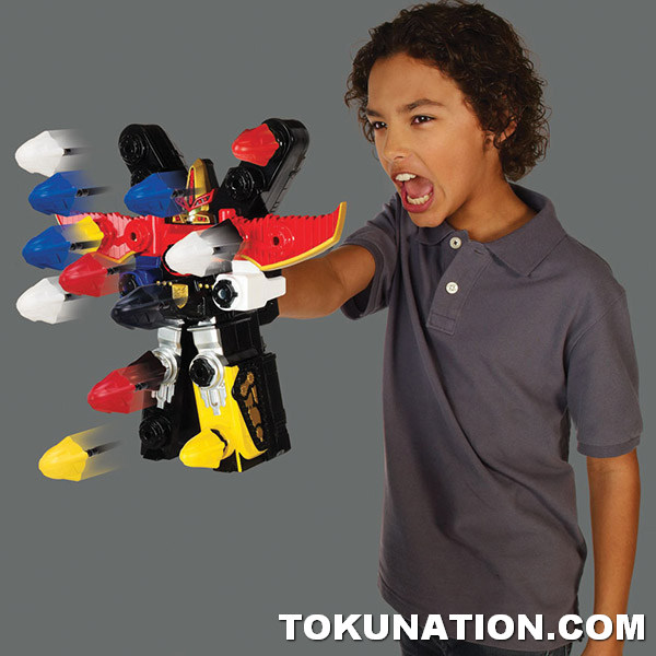 Battle evil wherever it may lurk with the powerful BattleFire Ultra Gosei Great Megazord! When the battle gets big, the Rangers summon all of their Zords together to morph into this powerful weapon. Command and control the action by using your voice! Fire up to 15 Zord missiles by utilizing the innovative voice recognition technology or the included manual trigger. Lights and sounds add to the excitement of this awesome toy. Target your enemies to save the day! Power Rangers BattleFire Ultra Gosei Great Megazord SRP $44.99 (each sold separately)