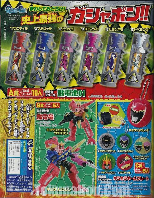 Scans reveal that the Zyudenchi can bestow other powers to the Kyoryuger! Examples include #15 Allomerus, which allows the user to launch a stream of fire from the Gaburevolver and #13 Kentrospiker, which allows the Gaburevolver to launch needle shots! Also seen are more images of Beast Hyper, Super Hero Taisen Z, and several toys, such as the DX DeinoChaser and KyoryuRed Set, and the first clear image of the PlaMonster, Violet Golem! For those collecting Zyudenchi, the Candy Toy and Gashapon sets are shown! Also the next Candy Toy Wizard Ring Set! Candy Toy Set 1: Gabutyra, Stegochi, Dricera, Allomerus, and Igeranodon. Gashapon Set 1: Gabutyra, Stegochi, Dricera, Stymero, Beyonsmo, and Tuperanda. Candy Toy Wizard Ring Set 7: Excite, Please, Light, Drill, Hibiki, Agito, ZX and Amazon. And if the pictures aren't enough of an incentive to pick up a Televi-Magazine, the bonus along with them make them worth the price! Included in this month's edition is a unique Ganbaride Card of Wizard's Four Dragon Styles, and a clear orange Big Wizard Ring! And judging from the scans, next month's bonus will be a clear Ankyodon Zyudenchi! Check Out The Scans!