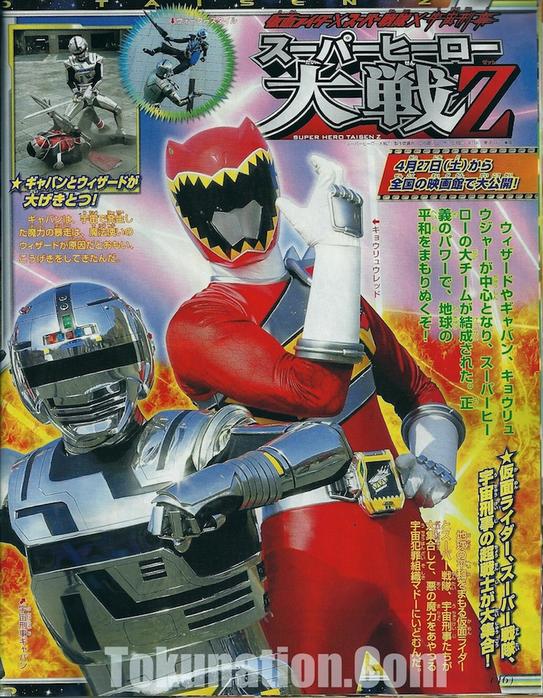 Scans reveal that the Zyudenchi can bestow other powers to the Kyoryuger! Examples include #15 Allomerus, which allows the user to launch a stream of fire from the Gaburevolver and #13 Kentrospiker, which allows the Gaburevolver to launch needle shots! Also seen are more images of Beast Hyper, Super Hero Taisen Z, and several toys, such as the DX DeinoChaser and KyoryuRed Set, and the first clear image of the PlaMonster, Violet Golem! For those collecting Zyudenchi, the Candy Toy and Gashapon sets are shown! Also the next Candy Toy Wizard Ring Set! Candy Toy Set 1: Gabutyra, Stegochi, Dricera, Allomerus, and Igeranodon. Gashapon Set 1: Gabutyra, Stegochi, Dricera, Stymero, Beyonsmo, and Tuperanda. Candy Toy Wizard Ring Set 7: Excite, Please, Light, Drill, Hibiki, Agito, ZX and Amazon. And if the pictures aren't enough of an incentive to pick up a Televi-Magazine, the bonus along with them make them worth the price! Included in this month's edition is a unique Ganbaride Card of Wizard's Four Dragon Styles, and a clear orange Big Wizard Ring! And judging from the scans, next month's bonus will be a clear Ankyodon Zyudenchi! Check Out The Scans!