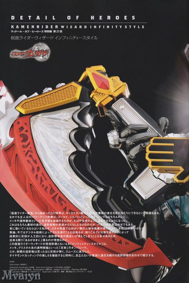 It seems that some new images of Kamen Rider Wizard Infinity Style are making the rounds today, credit to Tokunation user AoBlue. Uchusen Magazine #140 features an awesome multi-page spread on Wizards' ultimate form. Created from Harutos' tears and his desire to protect others, this form contains so much magical power that it transforms Wizardragon himself into it's weapon, the Axecalibur.