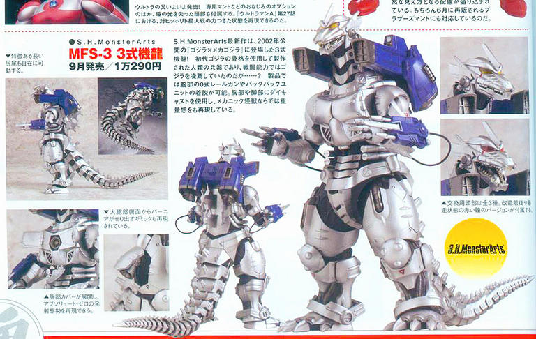 Did you think Bandai had really forgotten about the King of the Monsters, Godzilla? Worried about the state of the S.H. MonsterArts toyline? Not anymore! Among this month's crop of leaked Hobby Japan scans is this single image depicting the Millenium incarnation of MechaGodzilla, also known as Kiryu! Kiryu is in his first appearance from the 2002 film Godzilla Against MechaGodzilla and will be a standard release for September. This Godzilla-powered cyborg retails for 10,290 yen, standing 15.5 cm or just over six inches tall. We have no details on accessories and alternate pieces yet, but fans will be happy to know that unlike the Heisei MechaGodzilla and Garuda, Kiryu's weapons/jetpack is already included! More details and a confirmation of release from North American licensed importer Bluefin are inevitable, so stay tuned! SOURCE: 2chan