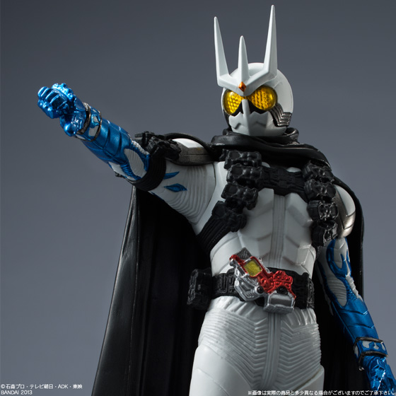 The set recreates the final battle in Kamen Rider W Forever A To Z: The Gaia Memories of Fate and each figure will be connected to his own personal display stand. Gold Extreme’s stand has been modeled after the Extreme Memory and Eternal’s stand represents the Lost Driver. Gold Extreme’s stand will feature LEDs and in addition you can connect it to Eternal’s stand. Pre orders have already begun for this set it will retail for 3360 yen. The set will be shipping out in March 2014. Last edited by Baltan II; 08-31-2013 at 10:29 AM.. |