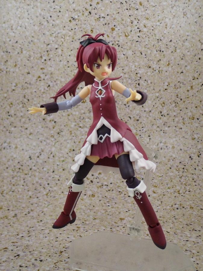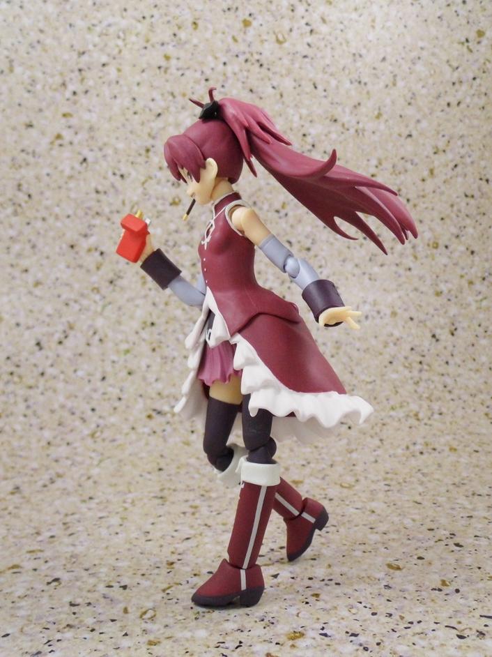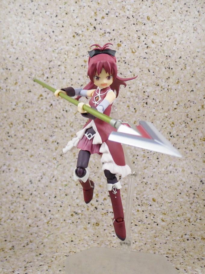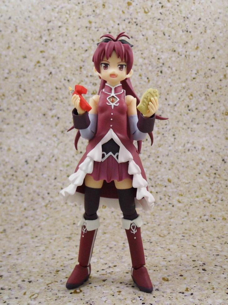 She comes with the almost requisite three inter-changable faces, ten hand optins, her signature polearm, a segmented polearm, two "rocky" sticks, a delicious taiyaki to eat, and an innocent looking Kyubey to dangle from her hand.