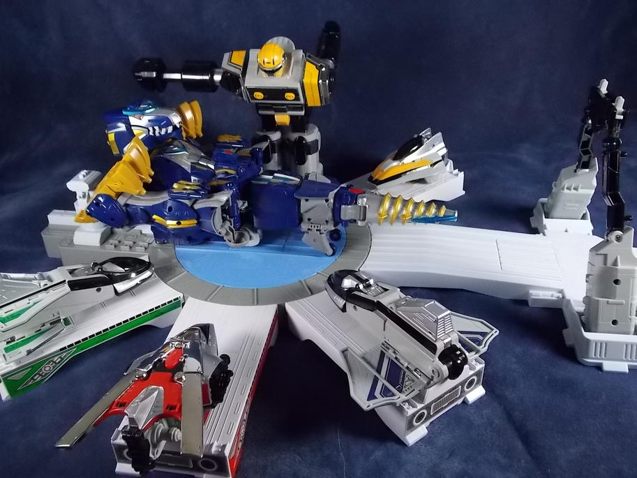 To round out last months look at Power Rangers Time Force we have a look today at the DX Providas Base & Robo from Mirai Sentai Timeranger! Providas base is unique in that it's one of the few times an actual to scale base play set has been designed for a sentai to accommodate a DX robo, in this case 3! This also means that the base is HUGE and required a much larger setup to photograph properly. It's also unique in that there is no US equivalent or release of this figure and play set. The base can accommodate all 5 Time Jets, Time Shadow, the Time Flyer, and the Chrono-Ship Yglieg! (The Time Flyer feature will be showcased in it's gallery) Providas Robo itself is not meant for combat and only appears outside the base in a single episode of both Timeranger and Time Force. The DX Providas Robo features a spinning punch gimmick, and just like it's on screen counterpart it can be used to "launch" time ships. If you're wondering about the last image that's the DX Gozyujin in Drill formation from Kaizoku Sentai Gokaiger. In Gokaiger the Gozyudrill was built by the Timerangers and was sent back in time from Providas Base any time Gokai Silver called upon it. A very cool nod from the 35th anniversary sentai! Want TokuNation.com updates on the go? "Like" us on Facebook and follow us @tokunation on Twitter!!