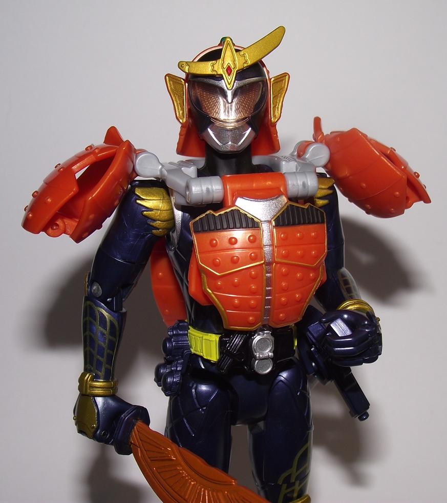 The armour doesn't peg down, but the joints are tight, and should they ever weaken, they're friction clip joints so you can stiffen them, but it's unlikely. It's a really good figure. Not super articulated, but good posability, and it looks nice. Sculpt is actually really good on the belt, the knife is even a seperate piece, though the locks are not given any specific details so you don't put pine arms on a Gaim with the orange lock on. Also the hand joints are tight. He doesn't feel like he's gonna drop his weapons constantly like my old SH Den-O figures. I'm quite impressed. I didn't no they did the gimmick figures this good. Quote: