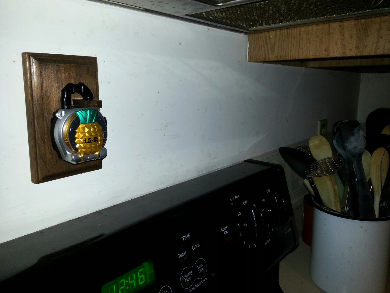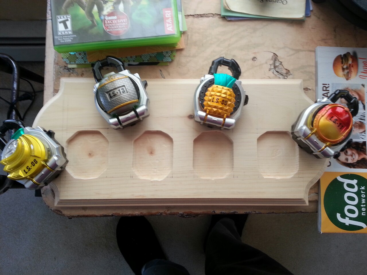 The plan is simple, buy four capsule toy Lock Seeds of my favorite fruit (banana, pineapple, mango, and kiwi) and mount them on a wood stained plaque from a craft store. This of course meant I had to somehow carve out a notch for each one...which was the first hurdle. I looked around and got myself a budge model Dremmel, a carving guide attachment, and a carving drum head. At first I was going to go all in on the first go of it...then I thought it might be best to do a test run on a cheaper, smaller, plaque seeing as I never in my life have used a Dremmel tool or attempted any kind of wood working outside of Shop Class. Good thing I did. The first attempt was butchered horribly, as you can see in the first few pictures. The notch was an awful rounded thing that showed gaps on the sides when mounted, I used the grinding head to sand the wood (which burned it horribly), and I mis-measured the placement of the locking piece, which also broke as I tried to attach it. ...but the proof of concept was there, and it looked cool. But, I still wanted to give it another try before going on to the final product. As you can see, my second go was vastly improved. I took my time, edged with a smaller carving head, and sanded by hand. The locking piece is still a bit rough (it's balsa wood so the carving bit chewed it up around corners), but it's damn good. **UPDATE** 01/18/14 Did the staining and seal coat today, which completes the prototype process. As you can see from the new pictures, the staining is a little uneven, but that's what the prototype is for. It looks great otherwise, especially when mounted on the wall. Although, supplies cost a bit more than expected for this stage, so unfortunately I have to wait until next paycheck to start with the final, larger, plaque. **UPDATE** 02/09/14 Carved out the slots for the large plaque, not nearly as clean as my prototype unfortunately, but it works. I'm waiting to get some better wood to make the locking pieces, Balsa wood gets eaten up by the dremmel bit and doesn't look at all presentable. **UPDATE** 04/12/14 It's finally done!!! As you can see from the images, there's a bit of a learning curve between the prototype and the final in many ways. I got better with the dremmel, used better wood for the locking pieces, and learned how to stain properly. I also learned that crazy glue was probably not the best way to attach the locking pieces, as, even if you sand it down, it does something to the wood that makes it damn near impossible to stain properly. Oh well. I'm happy with it, that's all that matters. Trying to decide what to do with the prototype piece. It's far from perfect so I wouldn't feel comfortable selling it. Maybe I'll see if anyone is interested in trading for a small gashapon toy or something. Message me if you are interested. As far as taking commissions for these things? I'm still on the fence. On the one hand, I have A LOT of stain left. On the other, I don't know if I've gotten good enough with the dremmel to start charging folks yet. We'll see what happens in the future. But for now, I'm going to enjoy my new kitchen decor!