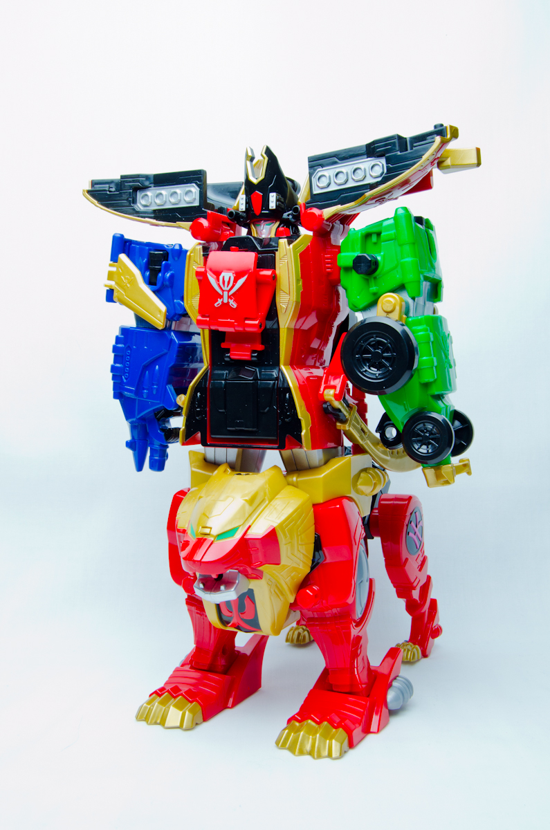 The combined mode is awful. I have seen so many people try and defend it by saying it looks more "streamlined" or "samuraiesque" or what have you (neither of which are particularly true), but it in reality it just looks dismal compared to Samurai Gokaioh. The legs sticking out over the shoulders do not even slightly look like shoulder pads, they just look like lion legs sticking out the sides. There has been no effort to hide that.