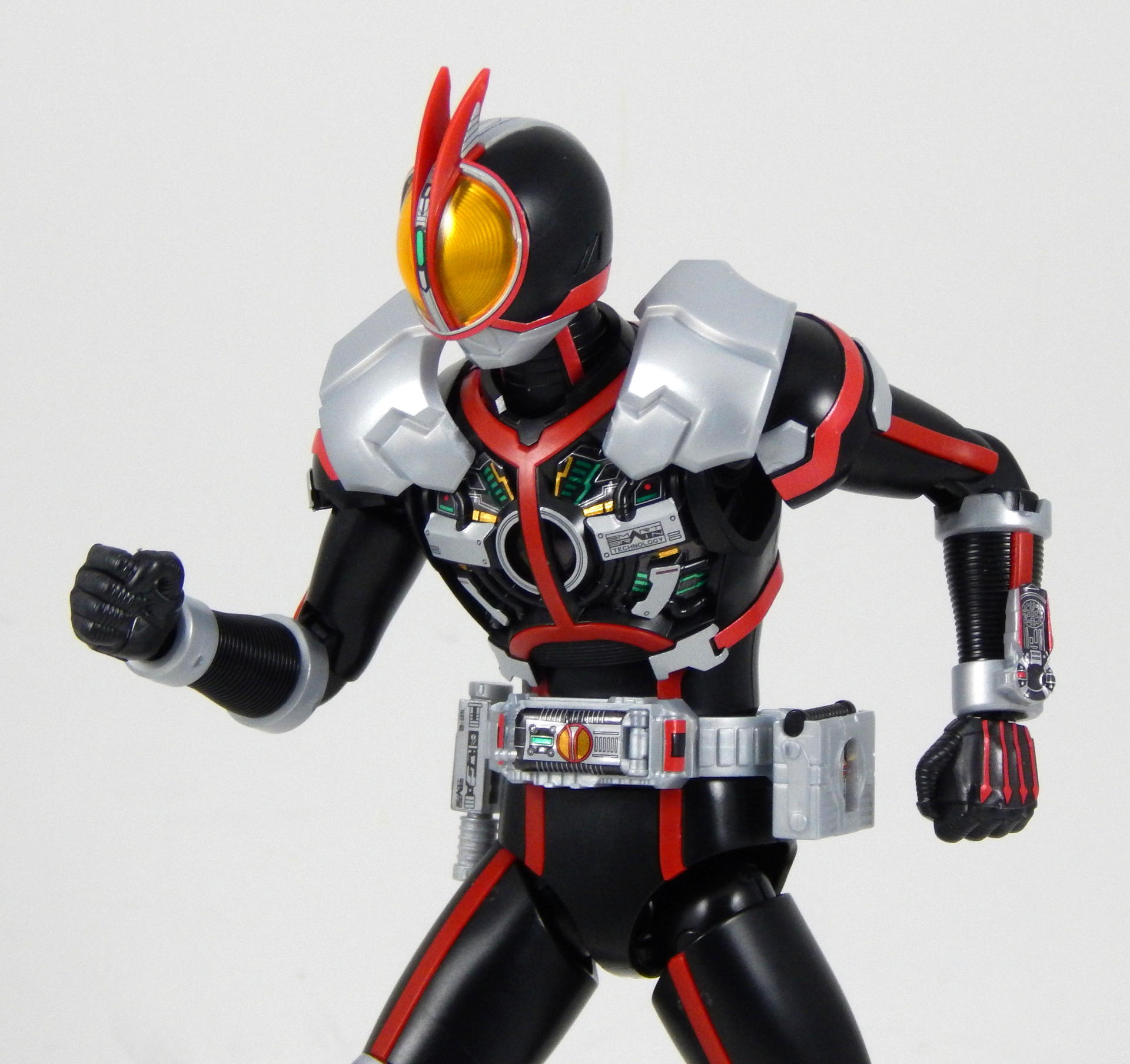 In short, this model kit was fun to build, it's quite detailed, it is very poseable, and has a great selection of accessories. It's a little bigger than the Figuarts, closer in scale to the Star Wars Black 6" figures and Marvel Legends. That's the minimum you should know about this kit. For further thoughts and info, read on. I have a smattering of experience with Bandai models, having assembled a couple each of Gundam High Grades, Master Grades and Real Grades, as well as some Kamen Rider Master Grade Figure-rise kits (TaToBa and all of the W kits, except CycloneJoker). This is my first experience with the Figure-rise 6 line, and it reminded me most of the more recent High Grade Gundam kits, in that it was both simpler than the Master Grade lines, but still surprisingly detailed. Consisting of 6 trees of parts (one of which is the stand, one being the effects pieces), Faiz doesn't have a super high parts count, but what he has is impressive. A lot of the detail is dealt with via stickers (there is an impressive sheet of around 60 labels), but a decent amount is managed through plastic. Take the red power lines all through Faiz' suit. It's about 50/50 split between red plastic and red stickers. The stickers are slightly metallic red, while the plastic is a more dull red, but the difference isn't all that noticeable. It is the main point where a Master Grade would be an improvement though, as I would expect much more of the red lines to be handled by plastic. I found the stickers to be a breeze to apply, even the longer straight ones weren't difficult to get aligned correctly. The only stickers that don't go one easily, or don't look pretty natural when applied, are those that go over the Mission Memory sculpts. It's hard to get them to lie smoothly on the big, rounded surface. The kit snaps together easily, everything fits together snugly. Some of the pieces require a decent amount of force to snap into place. I didn't push the arms into the shoulder joints hard enough at first, so you may notice that in some of the pictures there's a bit of a gap between the biceps and the shoulders. The articulation is quite good, nearly on part with a Figuarts, in most places. The biggest disappointment to me, is that the foot is one solid piece. I really like toys to have toe joints. The wrists are probably the most limited joint, with almost no range to them. Everything else is going to give you all the range you want. The two torso ball joints, in particular, I found to have a really good range of movement. The hips even hinge downward like the Figuarts to, allowing the legs to reach higher than the sculpt would otherwise allow (though it can introduce unsightly gaps in the sculpt in some poses). The figure is much lighter than the Faiz Figuarts, despite being a little bit larger. It balances very well, despite the light, plastic feet, though one of the one-legged poses I put him in require a couple extra minutes of fiddling with to get him to balance right. As for accessories, Figure-rise Faiz comes with everything he could possibly need for his default form, and a little more even. He has two pairs of hands, fists and open hands, and two gripping right hands. He has the Faiz Pointer in two modes, the Faiz Shot with working handle and holder, as well as an extra Faiz Shot sculpted into the holder. There are three versions of the phone, the Faiz Edge, and finally, there is the Axel Watch, which can attach to his left wrist. Comparing the accessories to those of the Figuarts, the Figure-rise versions are a little bit more detailed, in some respects, thanks to the stickers, but the Figuarts make up for it in paint. We get three variations on the Faiz Phone, one molded in gun mode (with a slight chunk removed from the handle so it fits in the gun-holding hand better). The other two phones are constructed of three pieces and are functional in ways I did not expect on a 6 inch figure, indeed, the Figuarts doesn't include functional phones like this either. The phones flip open and closed, and can even turn into the gun mode. It's definitely something I would have only expected for the larger MG Figure-rise line. The difference between them is that one is sculpted and stickered without the Mission Memory. The only drawbacks to the accessories is firstly, the Faiz Edge remains nearly colorless in the stock build. There is no red sticker for the blade part of it, nor the black grip. All we get is a Mission Memory sticker, and that's a bit disappointing, though likely stickers would have been unpleasant to apply, or looked bad. Secondly, I would have really liked a case to hold the Faiz Gear in. I have a thing for gear that stores neatly in cases, and the Double Driver case and memories that comes with MG Figure-rise Skull is honestly half of the reason that I bought that kit. But, while a case for the gear would have been an awesome addition, it is by no means a requirement for a kit such as this, so it's not something that really counts against it. For this review, I build the figure as directed by the manual, to show what the stock build looks like. It's mostly quite nice, but to improve it a little, all of the red plastic lines could be painted over with metallic red, to make them match the stickers better, and, like the Figuarts, the fingertips lack the silver paint that is one of the standout aspects of the Faiz suits. The silver plastic is noticeably swirly in places, so it would also benefit from some silver paint (I did so on the MG Figure-rise Accel kit, and it massively improved the look). Speaking of silver paint, this figure can be customized into Faiz Axel Form by painting all the red lines silver, and opening the chest pieces, which are constructed specifically for this option. Overall, I was very please with this kit. It's an excellent representation of one of my favorite suit designs, I would definitely buy a Faiz Blaster Form kit, as well as kits of the other Riders from this show. It feat