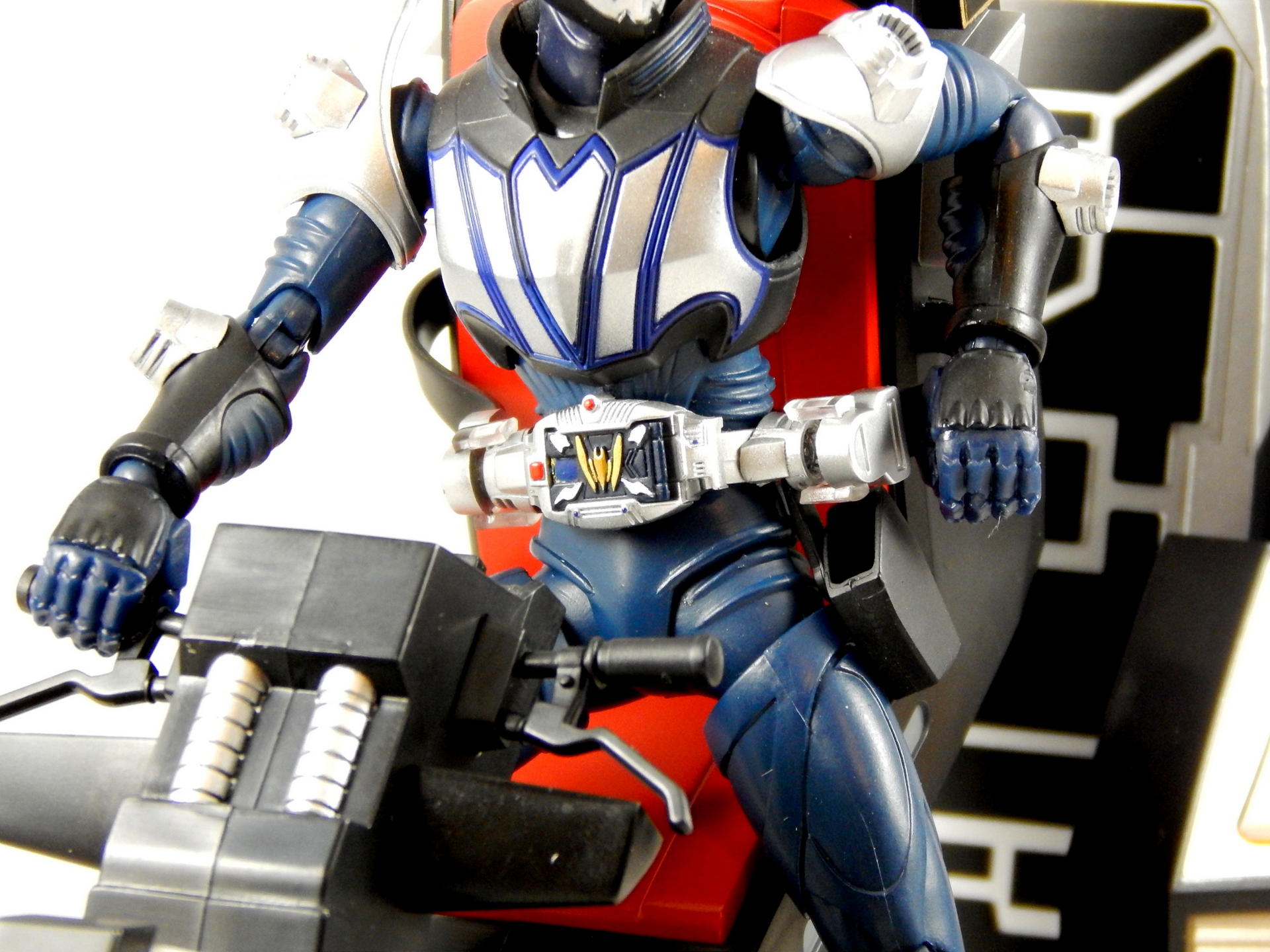As with all releases in the SH Figuarts Kamen Rider Ryuki line, Ride Shooter has a detailed sculpt and beautiful paint. It also has a smokey clear canopy, rubber tires (with two different tread styles), free spinning wheels, a control panel with a nice sticker for this display and an opening drawer (for an Advent Card? I don't remember this from the show), retractable belts, and two adjustable kick stands. This kick stands are completely superfluous, as the bike is very wide and low to the ground in the back, oh, and the rear tire is actually a double tire, and both are quite wide, it needs no help standing upright, unlike the more traditional bikes of other Riders. The belts are on a soft, flexible rubber, which makes attaching them quite painless, though they're showing signs of staying in the pose I've had them in for a few days. The belt ends feature clear clips that snap over the existing ports on the Ryuki figures and stay in place. The canopy raises, to about halfway, by itself, then engages some gears that raises the seat and lowers the foot pedals. It all works together quite nicely, and there's a pneumatic-looking cylinder under the seat that is revealed as the seat raises, which creates the illusion of real-life mechanisms. The black square thing on the front of the bike is a lock for the canopy, to keep it closed (I didn't realize during the photo shoot, so it isn't engaged in any of my pictures). Now, unlike some of the other Kamen Rider bikes I have, Ride Shooter fits its figures perfectly. They sit flush on the seat, can lean against the back and grasp the handlebars WITHOUT wrenching their arms forward as much as possible, which distorts the shoulder joint, unlike certain other Riders must do (W). Because the footrests rotate as the seat rises, a figure can remain in seated position while the seat raises/lowers. Since I also own the much older DX Ride Shooter release, I want to compare the two, help you decide which you should get. They are, as far as I can tell, completely distinct pieces. The DX is shorter in height, shorter in length, and slightly fatter. The canopy open/seat raising gimmick is spring-loaded, such that you push a button and the canopy flies open with surprising speed, and the seat jump up with enough force to catapult the figure unlucky enough to be seated therein out of said seat and across the table. The DX also contains a significant portion of die-cast metal, which makes it capable of causing blunt force trauma, should such a thing be necessary while it was on hand. The sculpt of the DX is noticeably different from the Figuarts version in many of the details. I haven't checked, but my money is on the Figuarts version being more show accurate. Finally, the DX isn't quite scaled right to Figuarts figures. They don't quite fit in the seat right, most egregiously their butt hovers above the seat, their knees hit the handlebars while their back is firmly back against the seat. And the belt connections don't work at all with Figuarts. In my opinion, Figuarts Ride Shooter is superior to the DX in every way, and is the preferable toy. Except that the DX can be had for about $25-$35 before shipping, on Mandarake. As for drawbacks, Ride Shooter was a Tamashii Web Exclusive, it required the additional cost of getting a middleman to get my hands on it. Hopefully the aftermarket price won't be too unreasonable (unlike say, Kamen Rider Gai). Additionally it's significantly larger and heavier than the other Riders' bikes, so it will take up more room on your shelf and cost more to ship. Despite that, if you have the room and the means, I highly recommend this bike. It's the most unique looking of all Kamen Rider bikes, and has far more action features and gimmicks than any of the others. And hey, if you're completely crazy, you can try to acquire one for each of your Kamen Rider Ryuki figures. |
