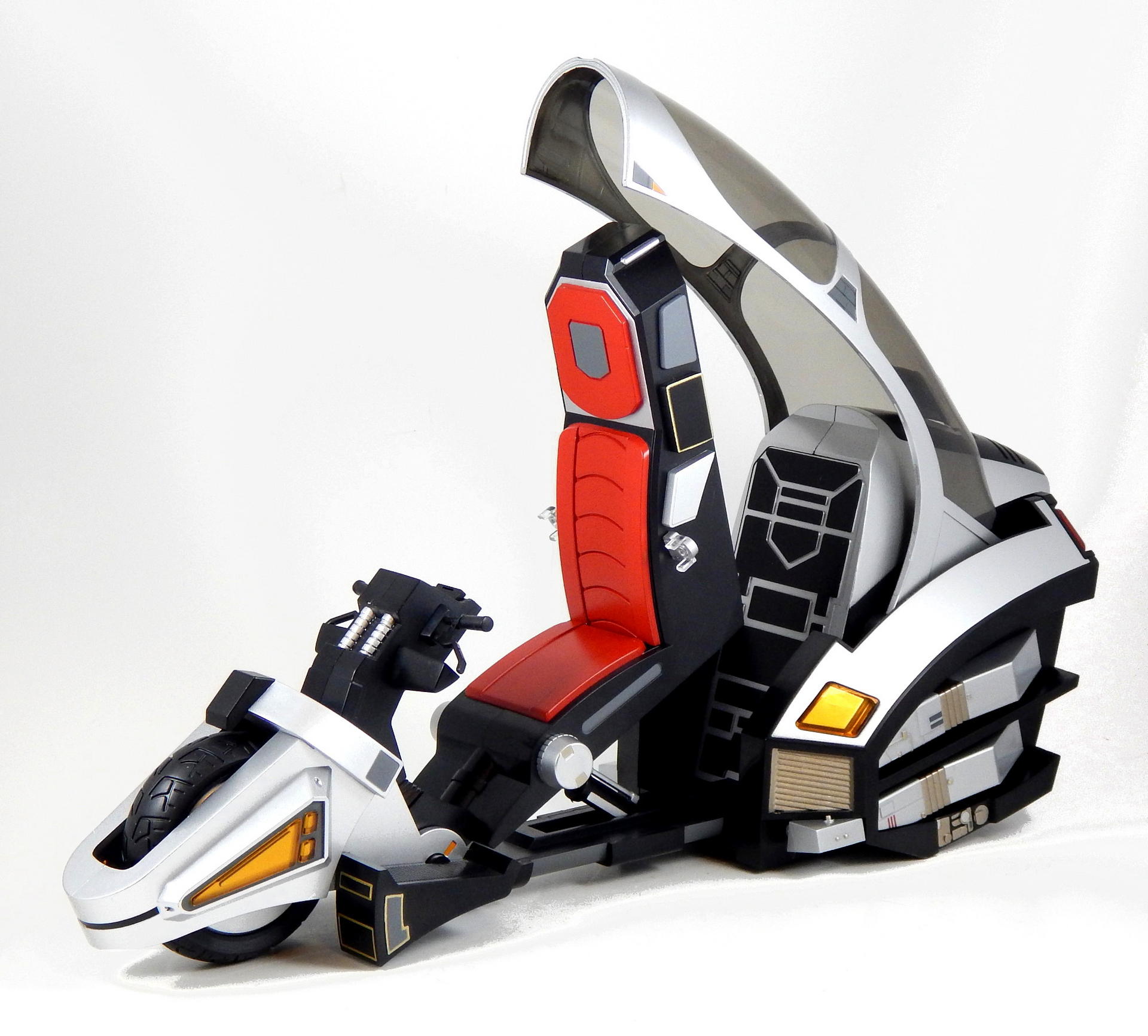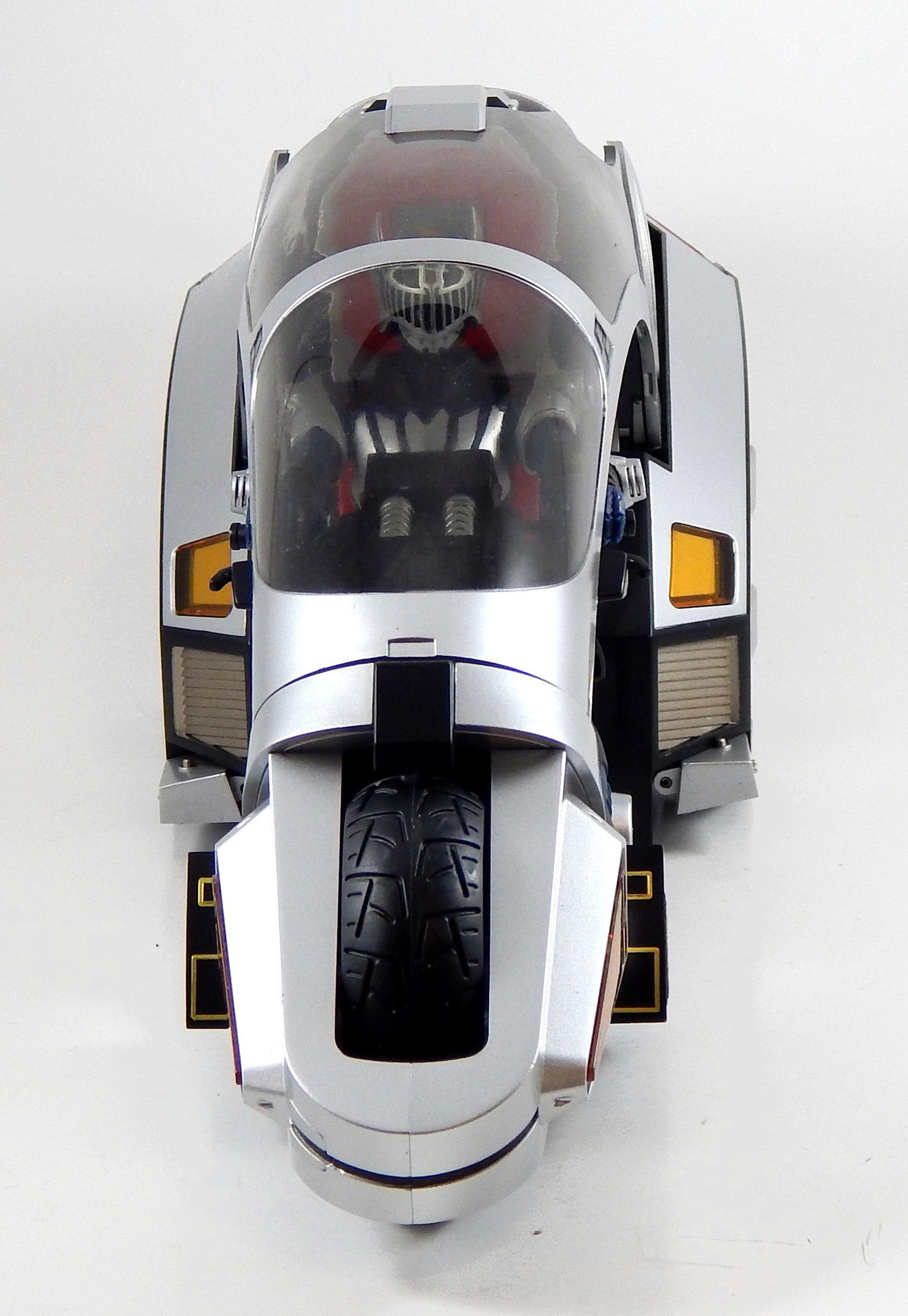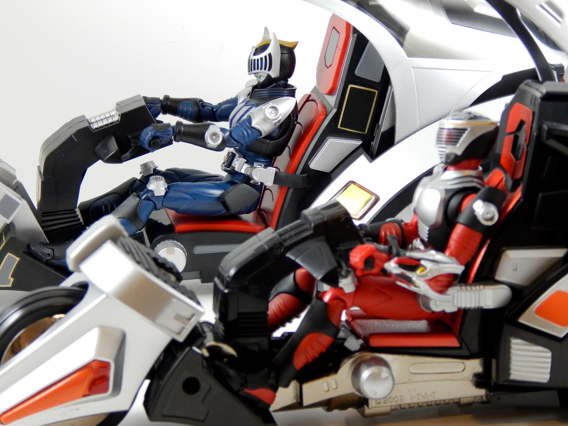As with all releases in the SH Figuarts Kamen Rider Ryuki line, Ride Shooter has a detailed sculpt and beautiful paint. It also has a smokey clear canopy, rubber tires (with two different tread styles), free spinning wheels, a control panel with a nice sticker for this display and an opening drawer (for an Advent Card? I don't remember this from the show), retractable belts, and two adjustable kick stands. This kick stands are completely superfluous, as the bike is very wide and low to the ground in the back, oh, and the rear tire is actually a double tire, and both are quite wide, it needs no help standing upright, unlike the more traditional bikes of other Riders. The belts are on a soft, flexible rubber, which makes attaching them quite painless, though they're showing signs of staying in the pose I've had them in for a few days. The belt ends feature clear clips that snap over the existing ports on the Ryuki figures and stay in place. The canopy raises, to about halfway, by itself, then engages some gears that raises the seat and lowers the foot pedals. It all works together quite nicely, and there's a pneumatic-looking cylinder under the seat that is revealed as the seat raises, which creates the illusion of real-life mechanisms. The black square thing on the front of the bike is a lock for the canopy, to keep it closed (I didn't realize during the photo shoot, so it isn't engaged in any of my pictures). Now, unlike some of the other Kamen Rider bikes I have, Ride Shooter fits its figures perfectly. They sit flush on the seat, can lean against the back and grasp the handlebars WITHOUT wrenching their arms forward as much as possible, which distorts the shoulder joint, unlike certain other Riders must do (W). Because the footrests rotate as the seat rises, a figure can remain in seated position while the seat raises/lowers. Since I also own the much older DX Ride Shooter release, I want to compare the two, help you decide which you should get. They are, as far as I can tell, completely distinct pieces. The DX is shorter in height, shorter in length, and slightly fatter. The canopy open/seat raising gimmick is spring-loaded, such that you push a button and the canopy flies open with surprising speed, and the seat jump up with enough force to catapult the figure unlucky enough to be seated therein out of said seat and across the table. The DX also contains a significant portion of die-cast metal, which makes it capable of causing blunt force trauma, should such a thing be necessary while it was on hand. The sculpt of the DX is noticeably different from the Figuarts version in many of the details. I haven't checked, but my money is on the Figuarts version being more show accurate. Finally, the DX isn't quite scaled right to Figuarts figures. They don't quite fit in the seat right, most egregiously their butt hovers above the seat, their knees hit the handlebars while their back is firmly back against the seat. And the belt connections don't work at all with Figuarts. In my opinion, Figuarts Ride Shooter is superior to the DX in every way, and is the preferable toy. Except that the DX can be had for about $25-$35 before shipping, on Mandarake. As for drawbacks, Ride Shooter was a Tamashii Web Exclusive, it required the additional cost of getting a middleman to get my hands on it. Hopefully the aftermarket price won't be too unreasonable (unlike say, Kamen Rider Gai). Additionally it's significantly larger and heavier than the other Riders' bikes, so it will take up more room on your shelf and cost more to ship. Despite that, if you have the room and the means, I highly recommend this bike. It's the most unique looking of all Kamen Rider bikes, and has far more action features and gimmicks than any of the others. And hey, if you're completely crazy, you can try to acquire one for each of your Kamen Rider Ryuki figures. |