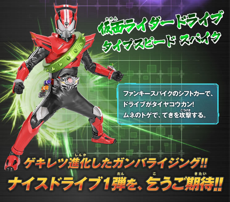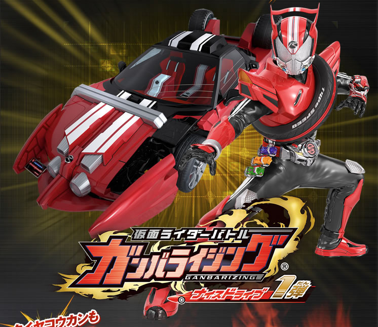 Coming in October Kamen Rider Drive will now be in the Kamen Rider Ganbarizing arcade game Titled Nice Drive Vol. 1, it will also include Kamen Rider Drive Type Speeds form change/braces such as Type SpeedFlare, Type SpeedShadow, and Type SpeedSpike.