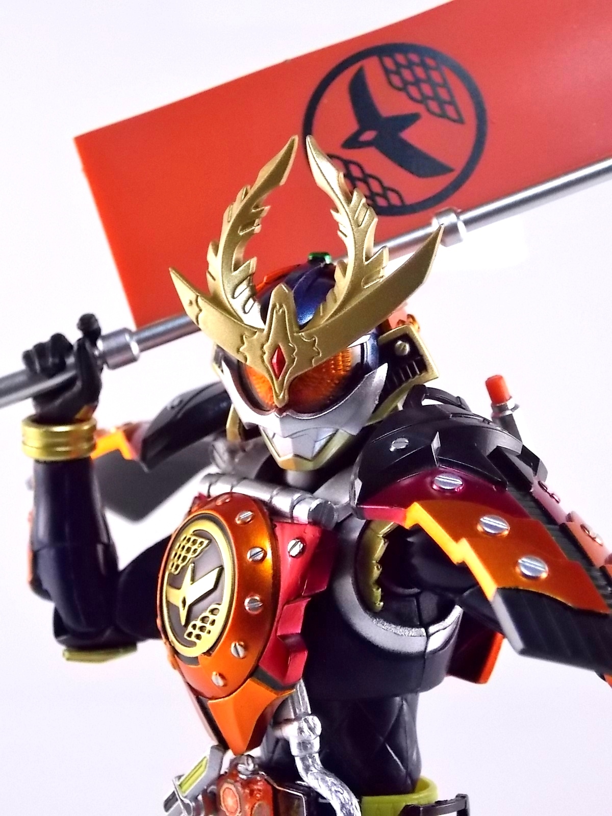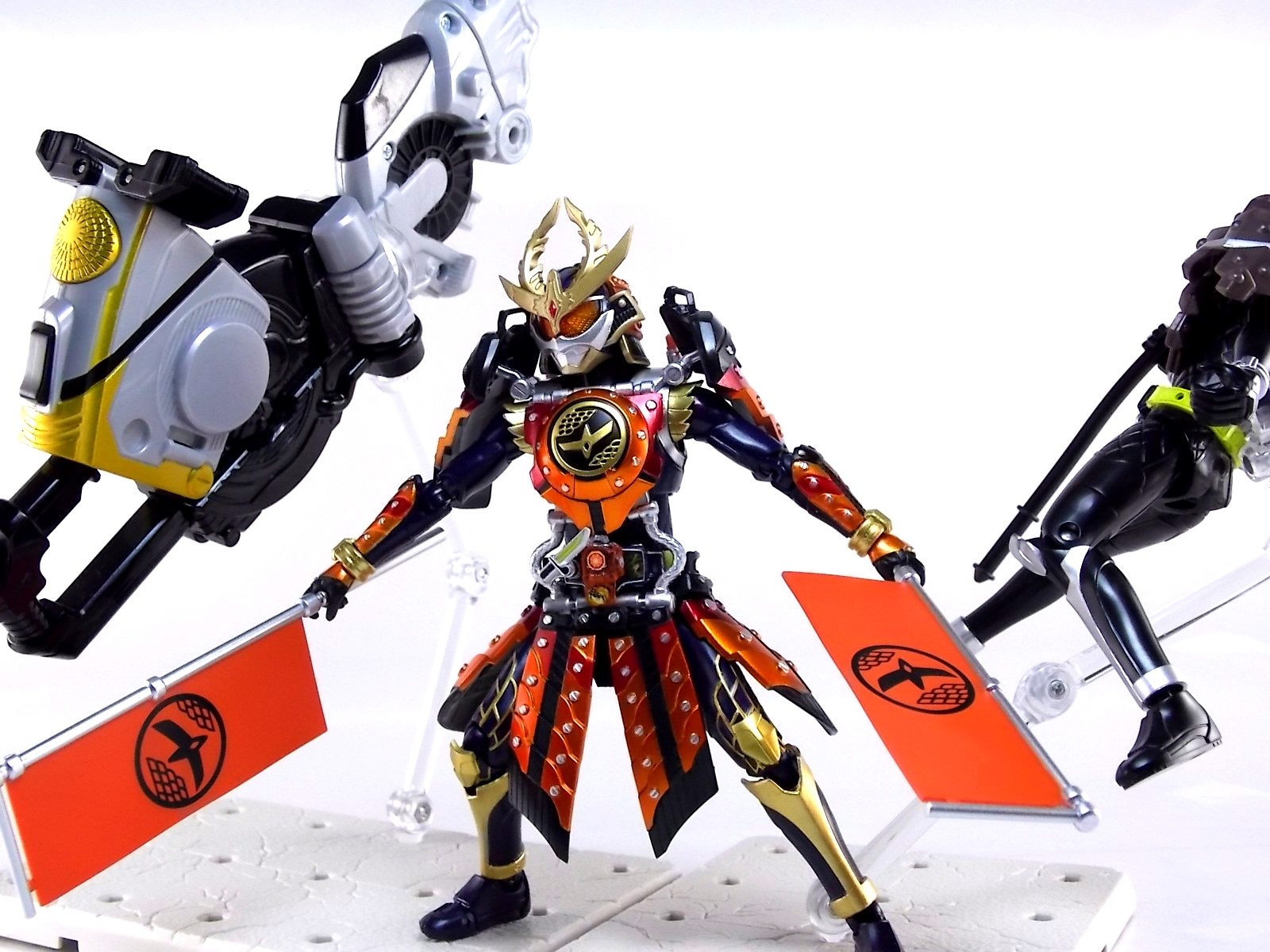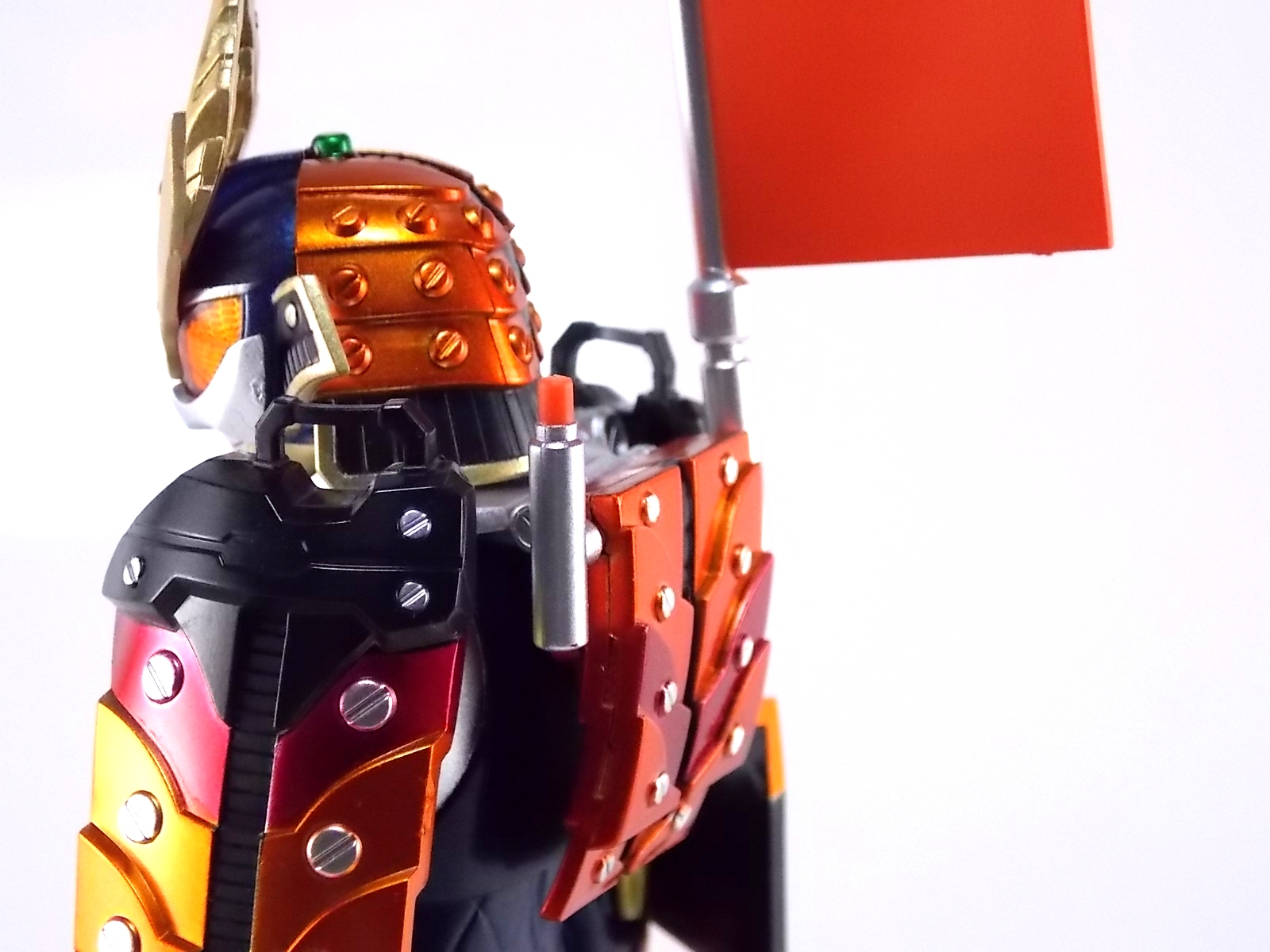 Raise up your flag if you know what I mean TokuNation is proud to finally present a gallery of one of the more hotly anticipated figures this year. S.H. Figuarts Kamen Rider Gaim Kachidoki Arms! Recently released at mass retail Kachidoki Arms is already in short supply, fetching about 6000 yen or more on the secondary market. Now let's jump in to our extensive look at this wonderful figure.**This is a HUGE gallery split into two posts, 40 images each. Packaging As has become tradition with Kamen Rider Gaim figuarts Kachidoki Arms comes in a wonderfully detailed box. Though Kachidoki clearly isn't a fruit but more of a robot samurai warlord mega orange tank of destruction, the box is themed in much the same manner as previous releases. Sort of a fruit bisection for the window, with great stock shots of the figure (which simply do not do it justice). Main Figure Let's just get it out of the way now, Kamen Rider Gaim Kachidoki Arms is glorious. Absolutely glorious. Forgetting whether you've seen the series or not, whether you've ever seen this suit design or not, it's a masterpiece in toy form. Let's start with the basic sculpt of things. Kachidoki Arms is magnificently detailed. I thought at the time that Gaim Orange Arms was released that Bandai had set a new bar for realistic detail on a figuart. With kachidoki in hand it feels almost as though they've set that bar even higher. In just about every way this figure captures the look of the on screen counterpart nearly perfectly. Just look at that head sculpt and the intricate detailing that's present, well, everywhere. There may be a few soft spots like the chest emblem but on the whole this bad boy is badass. The armor has crisp edges and sharp paint details, and on top of that works fantastically. Seriously the armor barely hinders the articulation of the basic Gaim body at all! Each of the skirt pieces can hinge up to an almost 90 degree angle and (depending on the tightness of the joints figure to figure) can maintain that position freely. You can actually get Gaim completely kneeling on two legs in a totally natural looking way. The shoulder armor is likewise hinged and ball jointed to not only allow for upward movement but also back/forward movement. Allowing you to really take advantage of some great action poses. Meanwhile the added attachments that run from the chest to the waist armor are actually made of a fairly soft rubbery plastic that's flexible enough to allow for a mostly normal range of waist movement. Speaking of the waist the Sengoku Drive belt is crazy loose, almost free spinning really. It's not bad and doesn't hurt the figures performance, it's just odd that it sits so loosely. You might also think that all this additional armor would mean this guy is off balance. Wrong. This thing is capable of the same types of poses that your standard Gaim would be. Now where this figure really shines is with the included accessories. Accessories Kamen Rider Gaim Kachidoki Arms is no slouch on the accessory count either. It really does include everything it could possibly need: 3 - sets of alternate hands. More than enough to adequately create whatever scenes you choose. 2 of these alt sets are specifically meant for holding the alternate forms of the DJ Gun so that leaves only one set of "expressive" hands. But that's okay. 1 - closed Kachidoki Lockseed. This of course is in addition to the already included opened lock that comes packaged on Gaim's driver and is removable. Having both gives you the option of attaching one version or the other to his belt and weapons to reenact specific scenes. As I've said before I don't particularly find much use for the extra locks but welcome their inclusion. 2 - Kachidoki Bata. These two flags emblazoned with Gaim's crest are actually pretty rad. The flags come pre-assembled so that Gaim can hold them and use them as weapons right out of the box. They look nice and are of course hard plastic as cloth items aren't really present in the SHF line. But cloth flags would have been nice. As is they're quite nice. If you unplug the lower handle on each flag you may then attach them to Kachidoki's backpack where the exposed pegs are already in place. So you've got options with these things. Compared to the Arms Change flags, which are pretty dinky, these things are perfect. 1 - DJ Gun (gun mode). Kachidoki's signature weapon/destroyer of Kurokage Troopers. It's like night and day when you compare this release of the gun to those included with the Arms Changes. While it can't functionally transform and the the DJ Scratch Table is (obviously) non-funtional the DJ Gun still succeeds in being a pretty great looking brick of plastic. The paint details are magnificent. I find the hand meant to hold the gun form is a little too relaxed so it's a loose fit. 1 - DJ Gun (Taiken Mode). Taiken mode is the combined form of the DJ Gun and Musou Saber. Sadly, despite how the AC version of this figure included alternate versions of the DJ Gun for combination AND a Musou Saber for said combination, S.H. Figuarts Kachidoki skimps out. Taiken Mode is molded into place permanently. The Musou Saber is not removable meaning Kachidoki also just doesn't come with one at all despite having used a standard Musou Saber in show on several occasions. Taiken Mode is beautifully sculpted and is an appropriately awesome weapon, but losing out on a Musou Saber does kind of suck. In short though Gaim Kachidoki Arms comes with everything it could really need. Aside from one pesky Musou Saber. Final Thoughts Though the show may be over Kamen Rider Gaim figuarts will continue to trickle out for likely the next year or so. Each successive release seems to improve a little in one area or another but honestly nothing has really topped that first Kamen Rider Gaim Orange Arms. But Kachidoki just might have matched it. With excellent details, a top notch paint job, a plethora of accessories, and a wide range of movement for such bulky armor, 