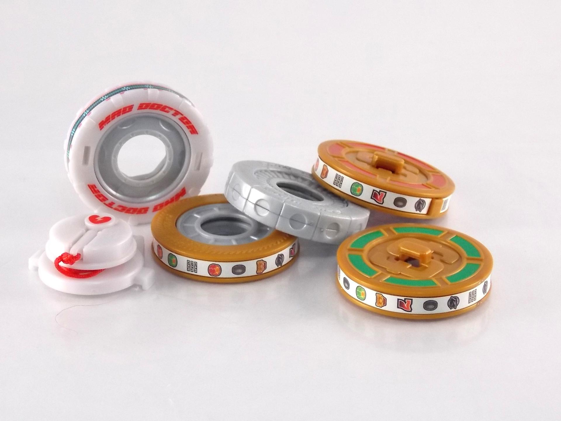 Packaging Nothing new to report here after 4 releases in this line. The mass retail toylines don't tend to have the fancy bells and whistles of Bandai's collector lines for packaging but they get the job done. This set is patterned in the same way as the TK-02 Tire Set. Just a nice slim box with some stock photography of how these tires interact with the various TK figures released thus far. This will be a fairly short and simple review. As this set doesn't really include a figure but just accessories to be used with one. Spin Mixer It should come as no surprise that the Spin Mixer Tire is by far the most boring and generic in the set. Seeing as Tire Set 2 is patterned in much the same way as Tire Set 1, we were bound to get one tire that didn't do much, or anything really. This tire's counterpart in set 1 is definitely Funky Spike, but at least it had spikes. Spin Mixer is decently sculpted with some nice rocky details but that's about it, no action feature on this one. It looks pretty sharp on Type Speed but fairly generic on Wild. Mad Doctor Now for the first interesting one of the bunch, it's the Mad Doctor Tire! This much more vibrantly colored tire doesn't come alone though as it's also packaged with the Cure Quicker healing device. The two can be combined primarily for use when attached to Tridoron, but it's an extra bit of play value the more standard tires don't have. It's very similar in that regard to Rumble Dump. The tire itself is a nice pearl white with a pretty great decal applied along it's tread simulating a heart rate monitor. The Cure Quicker amounts to being a mobile defibrillator and has the electrode attached via a small red vinyl cord. A fun additional accessory all in all. Dream Vegas As with the first Tire Set, there's a clear winner here, the Dream Vegas Tire! This quirky Tire has one of the more unique abilities in Kamen Rider Drive, one which mostly carries over to the toy. As a standard tire Vegas has some Drive inspired roulette emblems on it. Overall the detail on the decal featuring these emblems is quite nice. The same goes for the included weapons, the red & green Drum Shields. Sadly these drums can be a bit difficult to get a Tire Koukan figure to hold. A problem I've had with most mainline gimmick figures for Kamen Rider shows is that many figures use the same generic hands across releases, nothing is made specifically to hold anything with them. So sadly Drive's hands are a bit hard to use and get a firm grip on the Drums. The closest example I can think of in another line is the difficult way AC Kamen Rider Knuckle's gauntlets worked. But that's no the main reason you get this set. You want the Dream Vegas Tire to do some ridiculous torso extending on Drive! Just as in the show the Dream Vegas Tire and Drum Shields can be combined to form a new torso section on Drive! You need to attach the actual tire first to Type Speed Torso (or Wild's shoulder if you so choose). Then take either of the Drums and snap them over the connector on Drive that's still exposed when the tire itself is attached. Then attach the second drum to the first, and plug the other half of Drive back on the end. And there you go! One crazy stretched out yet weirdly properly balanced rider. Though on Type Wild it doesn't look crazy, it just weighs his arm down. But overall this is pretty damn awesome, even if it is a bit silly. Final Thoughts Clearly the TK-04 Tire Set 2 is really only a necessity if you own Drive Type Speed, Type Wild, or DX Tridoron already. Without one of these the tires won't serve much purpose. Overall this set I feel has a bit more to offer than the the TK-02 Tire Set 1. Primarily because Doctor & Vegas are fully realized and you only get one dud in Mixer, whereas with set 1 the real star was Monster. Once again I find myself rather pleased with Kamen Rider Drive. This toy line may have had a few weak tires, but it's unquestionable that these things are fun and offer lot's of swapping possibilities. This gimmick just really works for me.