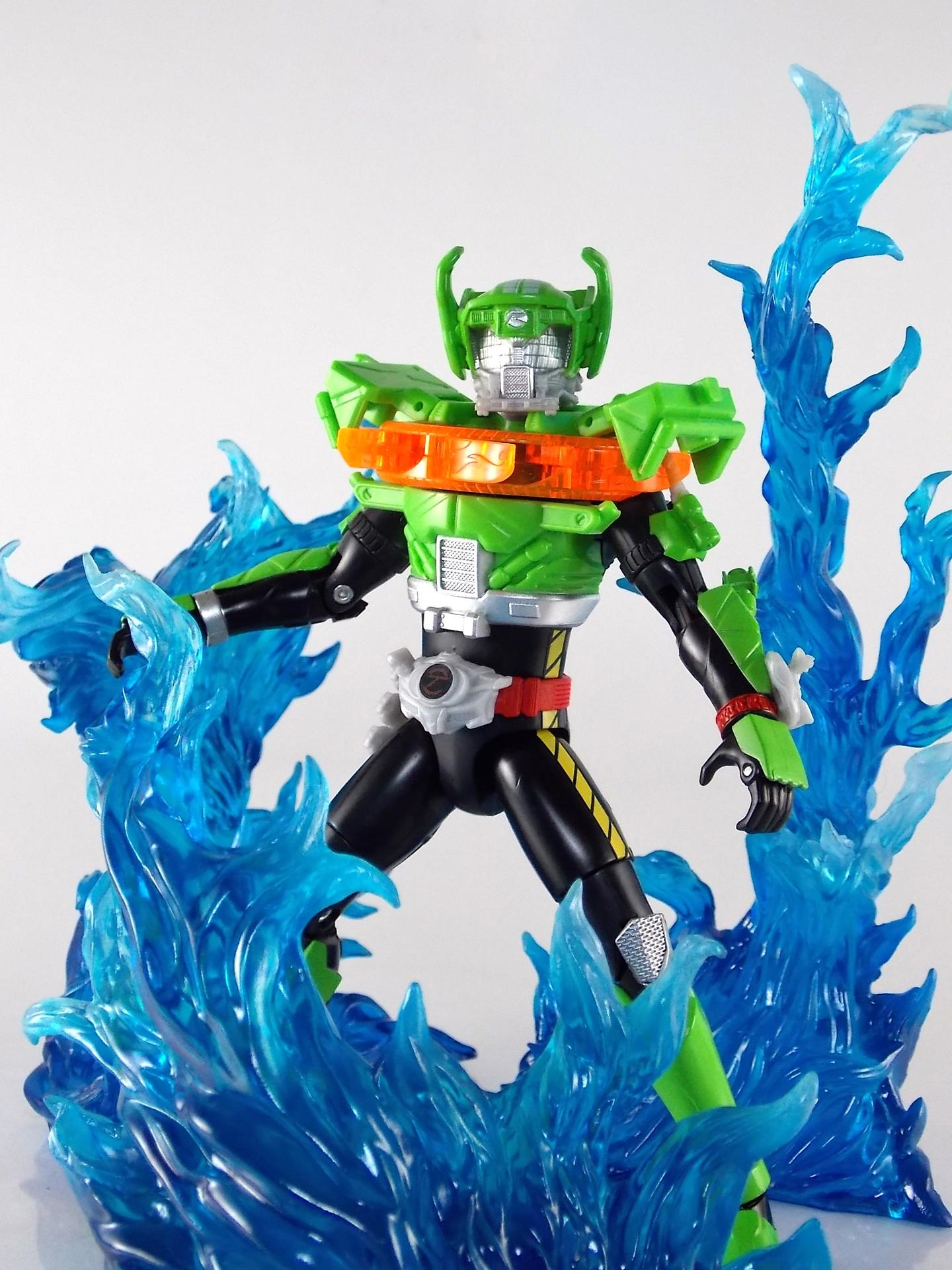 The figure looks good and seems to fit with the rest of the line. I don't like the tire whiplash collar. It looks like if you squeezed his legs he would shoot little discs out. The look just does not seem to fit the other 2 forms. I am behind on the show so if this form has shown up yet I have not seen it. Perhaps on the show it looks better but so far this is the weakest of the suit designs. Still digging the toy line and the gimmick this year.