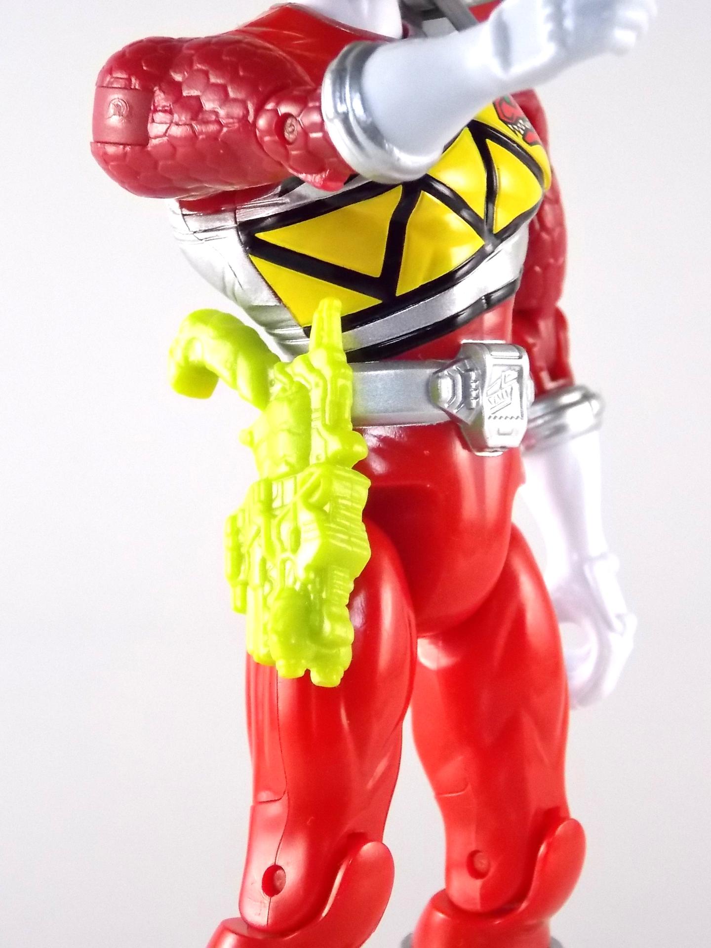 TokuNation is ready to ring in the new year with yet another gallery from Power Rangers Dino Charge! And today we're taking a look at the 5" Dino Charge Red Ranger! Packaging It seems that for this years rangers Bandai of America has stepped their game up from the rather bland semi-circular packaging of the Super Megaforce 5" line to what we have here. For Dino Charge we've been treated to some detailed packaging with pretty rad and elaborate graphics & images. Taking it's cues from the Super Megaforce line though this new 5" line also features a nice stock shot of the ranger in question on the back as well as a multi-lingual bio and a short list of stats. The packaging mistakenly labels the Red Ranger with the name Lucas, which was the original name for the character. The name was changed to Tyler when it was realized that Lucas had been used previously for the Blue Time Force Ranger. In any case it appears the change was made too late into the toy lines production cycle to change the name. A cross-sell along the bottom also advertises the other 4 Dino Charge Rangers as well as the initial villain figures for the line, Fury & the Viviks. Main Figure At this point there aren't many surprises left for figures in this scale. The Super Megaforce 5" was liked by many but was not without it's faults. While the figure were of decent quality most of the time they suffered from all too generic sculpting and parts reuse. While I'm sure that will happen here as well, for now Dino Charge Red Ranger is a fairly solid figure. It's standard fair as far as BOA figures go, but it's a pretty decent representation of the character. Definitely much more so than the barely articulated 5" Red that came with the Dino Cycle. While most of the basic tooling is similar if not identical to the Super Megaforce line, the Dino Charge suits feature much more detail, as do their figures. You'll see the standard hip peg hole and basic joints on theis figure. But the scaled look on the upper arms, the newly molded gauntlets, a decent head sculpt, and a hinged shoulder pad can go a long way to making a cheap figure like this look a little nicer. That being said I've seen reports from numerous collectors about sloppy paint applications on their 5" Dino Charge Rangers. While the paint apps are hardly accurate in the first place (inaccurate back of the suit and Dino Com) the overspray of silver on the Dino Com itself is pretty bad. Things like this are all too common in mass market toy lines like this but it's still a knock against an otherwise fine figure. Accessories As is the case with the other 4 simultaneously released Dino Charge Rangers, the 5" Red Ranger includes only two accessories: 1 - Dino Saber. Molded entirely in a lime green plastic this is the one part of the figure that does not exceed the predecessor line. No paint apps on the accessories makes look rather cheap. At least if you're going to cast it in a single color get that color right. While the blade should be this color the entire weapon shouldn't be. Though no one color would have really gotten the job done for this one. The sculpt is otherwise fairly intricate and detailed, a nice paint wash could actually bring quite a bit of that out. 1 - Dino Charge Morpher. Suffering from the same gang molded color issue as the Saber, the Morpher likewise has a great amount of detail that just can't be seen that well. If anything this accessory should have been cast in solid yellow rather than green to at least try to simulate what it should look like. Obviously these weapons don't combine into the Dino Cannon at this scale but that would have been a nice touch. Though it's only two accessories it's about the best we could have expected for a figure of this size at this price point. While they certainly aren't perfect, they do get the job done. Final Thoughts While I've never personally been the biggest fan of the 5" Power Rangers line, it's apparent that the Dino Charge 5" Rangers are nicer than what we got with Super Megaforce. Are they perfect? No, far from it. But for a collector on a budget who wants to own their favorite ranger this is a pretty good stand in. Paint & color issues aside the 5" Dino Charge Red Ranger will look great with most any other 5" ranger figures.