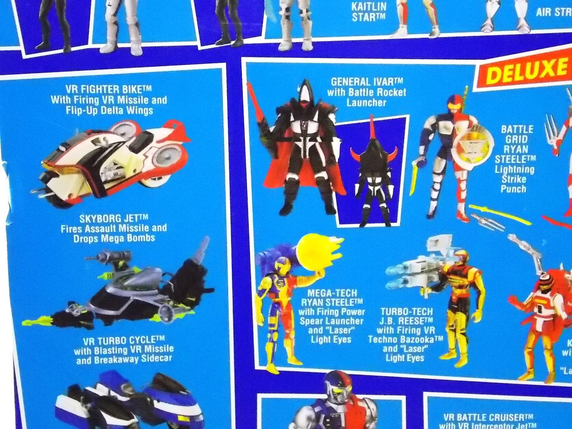 This unique form is the product of Saban's constraint to use both Metalder & Spielban footage during season 1 of the show. Since the footage came from 2 shows the 3 heroes could never really be shown together on screen without the cost of filming new footage with the Metalder, Spielban, & Diana Lady suits. The easiest solution was to create these new cheaper costumes and write them in as new forms. These were incredibly cheap spandex suits with basic padding on them that all featured poorly repainted Mighty Morphin Red Ranger helmets. Though they definitely aren't as polished as their finished counterparts, they're kind of a fun & quirky love child of the 90's american toku industry. The figure is itself much the same. Packaging Typical of the VR Troopers toy line Battle Grid Ryan Steele comes carded, though this card back is a bit larger than most of the figures released in the line. Packaged on the same style of widened cards as the Battle Tech & Turbo Tech figures, you can see tons of cross-sells for the rest of the line. These more Deluxe releases included more accessories than standard VR figures and generally featured weapons and designs not seen in the show. The Battle Grid suits themselves were featured in series, but the weapons the toys included were not. The front of the card features some seriously wicked art that makes a goofy spandex suit with a repainted Red Ranger helmet look truly awesome. Main Figure For those who don't know the VR Troopers toy line was actually contracted out by Bandai. Unlike their Power Rangers & Beetleborgs figures, VR Troopers was produced by Kenner. As a result the toy line wound up being a bit of a hodgepodge of various toys and figures, some Japanese molds, some new american molds, and even others imported from other toy lines. The Battle Grid figures are of course entirely US made. Battle Grid Ryan Steele is pretty unique. It's got the handicap of 90's articulation working against it, but it's otherwise a nice toy. It has basic shoulders & hips, and one "floppy" right elbow joint. It's meant to swing swing the attached blade for a Lightning Strike Punch attack when the legs are squeezed. The figure actually has more to it than the full suit did with the ribbed detailing. And although the show helmet is itself a repainted MMPR Red one, the toy is not a mere repaint but is an original mold meant to evoke it. Which is kind of ironic and awesome. Accessories Like any good action figure released in the 90's Battle Grid Ryan Steele included so many accessories that he can't even use them all, nor are any of them relevant to his show appearances. None of theme are officially named on the packaging or elsewhere: 2 - Energy Katanas. Each cast in translucent yellow plastic. They actually aren't that bad, but the figure is only capable of holding one at a time while storing the second in his back holster. Only the left hand is molded open to hold a weapon while the lightning strike right fist is molded shut. So the second katana is kind of overkill. One could assume this weapon is maybe an homage to Metalder's Katana, but that's probably not something that was part of the design process for this toy. 1 - Sai. This is a really odd one. As the only non-energized accessory in the set it's really out of place. Again Ryan can only hold it in his left hand or store it on his back, but that's now 3 weapons he includes with places to put only 2 of them. 1 - VR Troopers Shield. This one is the most awesome accessory in the set. Emblazoned with the VR Troopers logo it's clearly a toy only item that really screams 90's, but it's my favorite thing included with Ryan. Why not bash in a monsters face with a shield bearing your team's name? As with the above accessories you can only place this in his left hand and it can't be stored on his back, so you run into the accessory storage situation again. Though the accessories are confusing and superfluous they're right in line with what we should expect from a toy released in the mid-90's. Final Thoughts Obviously it's hard to review a toy like this 20 years after it's release and try to hold it to some kind of crazy modern standard. This thing is silly, fun, includes a ton of weapons, has an action feature, and honestly looks pretty cool. With some more basic articulation it'd be pretty much perfect. I'm always a sucker for forms created specifically for american toku shows and the Battle Grid suits from VR Troopers take the cake for most odd and fun. Battle Grid Ryan Steele is one weird and awesome piece in my collection. I have Kaitlin as well, but have never been able to find a J.B.