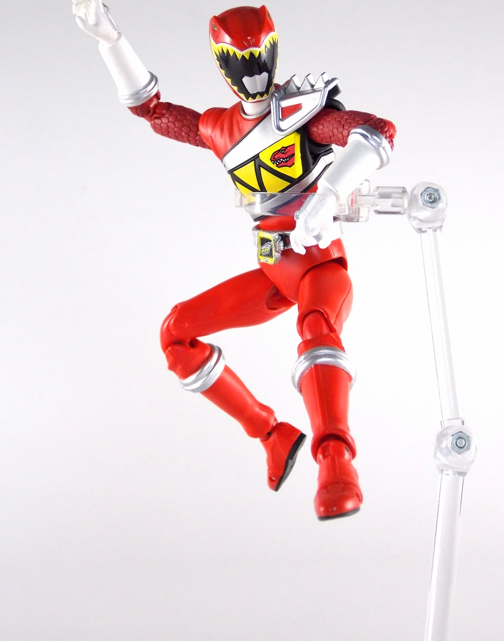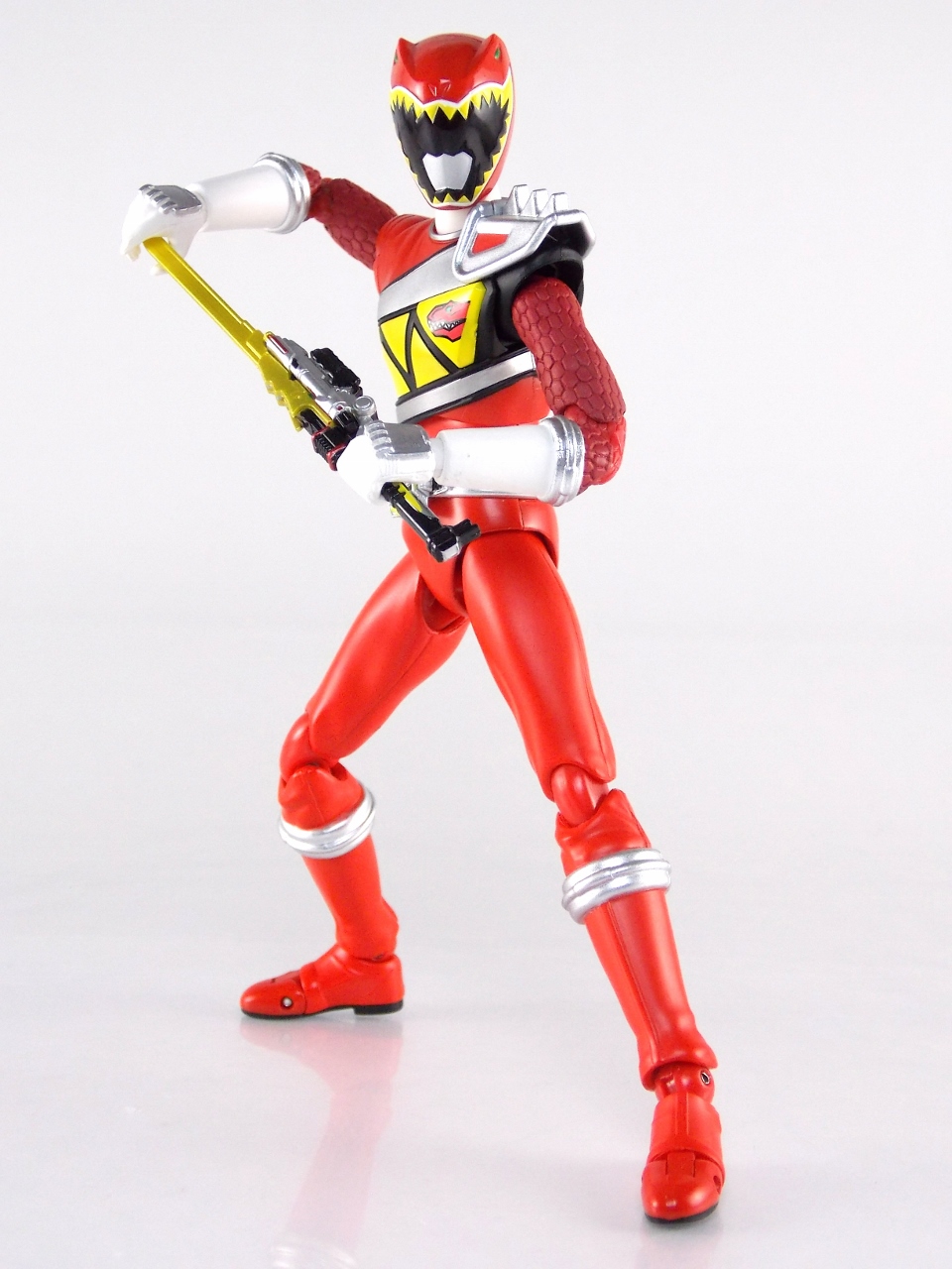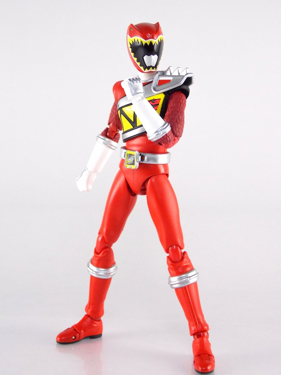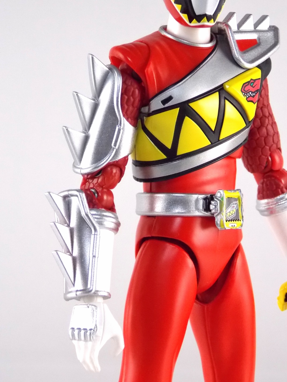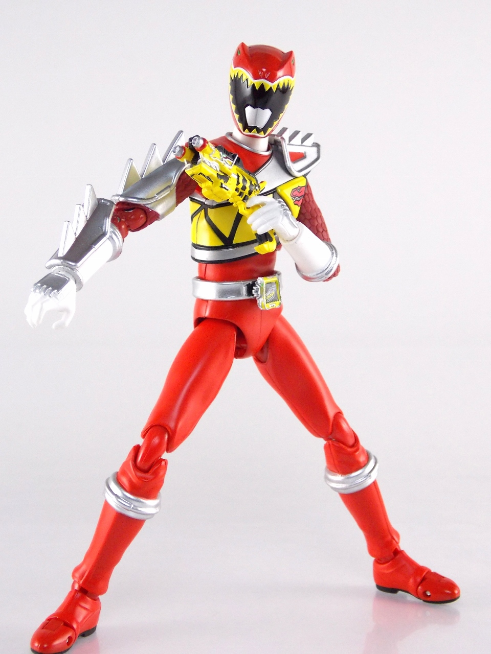 A renewed gallery for a new year! It's time for TokuNation to take it's Gallery 2.0 do-overs to the next level! Taking a look back at our archive of old galleries we thought that with the premiere of Power Rangers Dino Charge upon us it would be the opportune time to go back and give Zyuden Sentai Kyoryuger the TLC it deserves. So without further delay we now present S.H. Figuarts Kyoryu Red (Gallery 2.0)! Packaging Kyoryu Red comes in quite the interesting box. Though Sentai Figuarts haven't been around nearly as longs as Rider ones, they initially started out with the same boring box design. But in recent years Bandai's really gone all out, Kyoryuger figuarts are no different. Not just a simple window box, Kyoryu Red's really tries to evoke the general look and feel of his costume, right down to the "sash" across the window. The back of the box is also pretty snazy to just be a selection of stock photos. I mean honestly the Kyoryuger Boxes were some of the nicest sentai figuarts packaging for their time. Main Figure As with any time a new Sentai Figuart is release, Kyoryu Red is an entirely new base body. And wow what a nice one it is. The Kyoryuger designs are some of the more busy modern sentai suits we've had in a while, and I mean that in a good way. Luckily the busyness, in fact the more armored nature of this costume, lends itself that much more to being a toy. Where Riders Metal Heroes & the like have the advantage of armored costumes and less apparent articulation cuts, sentai costumes are basically fabric. So reproducing that in articulated toy form can be difficult. But Kyoryu Red really pulls off his look quite well. The lower half of the body is simple stuff. Come up to the belt though and look at the glorious detail on the Mobuckle. It's hard to see at that scale but the Kyoryuger emblem and even the eyes on the sides of the buckle are fully painted. The Mobuckle can also rotate to the side to simulate what happens when a Zyudenchi would normally be removed from inside. At this scale though they couldn't engineer the Mobuckle to open and store them. But that's okay as the included Zyudenchi is tiny. Further up brings us to the exquisitely molded arm details. Rather than go for a fishnet style paint job on the arms to get the scaly feel of the costume, Bandai has instead sculpted the detailing into the arms themselves! Thus creating a much more polished look that works better than I ever thought it would. The chest and head though are where the figure knocks it out of the park. As I said the more armored nature of the figure lends itself well to the toy makeover. The chest emblem, sash, shoulder, & back are all gloriously detailed and fully painted. The Gabutyra emblem in particular looks great. The head while well sculpted could stand to be painted just a little bit better. The front and back halves of it appear to actually be different colors under the right light. A minor gripe but one none the less. Otherwise it's dead on the show suit. And as for posability, well see for yourself below. Kyoryu Red can assume any of his iconic poses with ease and pretty great balance as well. The shoulder armor doesn't impact articulation either thanks to the hinge on the pad. So this guy has great open ranges of movement at his disposal. Accessories Kyoryu Red comes loaded down with a basically perfect assortment of what you need: 1 - Gaburevolver. The trademark weapon/henshin device of the Kyoryugers is done true justice here. You'd think at this size it would be missing paint apps but frankly it's perfect. It's just incredible how perfectly to scale this thing is painted compared to the real thing. Now the barrel doesn't spin nor can it open up on the end to accept Zyudenchi, but considering how small the Zyudenchi for these figuarts are that's fine. Once you got one in I'm sure it would never come out again. 1 - Generic Zyudenchi. Though by association this should be Gabutyra's Zyudenchi, it simply isn't painted correctly. Though to be fair none of the 6 Kyoryuger Figuarts have Zyudenchi with entirely accurate colors. But that's mostly because at this scale it's nigh impossible to paint properly. So some general colors are slapped on so you get a feel for it. Again this thing is infinitesimally small and I won't use it for anything again ever. I'm fine with it being kind of generic. 1 - Gaburicalibur. Again this is a wonderfully detailed piece. Right down to the most minor details this is a perfect recreation of the show prop. Again it does not open or accept batteries and I'm totally okay with that. What I'm not okay with however is that the Gaburevolver & Gaburicalibu do not combine into the Gaburicannon. Nor is a separately molded version of it included with any figuart. If a Kyoryu Violet is ever made it would almost certainly come with him/her as it was used quite often by the second (female) Violet. 3 - sets of additional hands. For your general needs. You get one set of Revolver hands, one set of Calibur hands, and one set of splayed out roll call pose hands. 1 - Armed On Arm. A great inclusion here is the option to display your figure as Kyoryu Red Armed On. To use this you need to (pretty forcefully) yank out his right arm at the shoulder socket. Then plug this one on. I've found this to be infuriatingly difficult to do with. Most of the time I can get it more or less on but can't always get that last "click" to lock it into place. But when you do, and then the arm stays up properly, the look is very satisfying. 1 - Gabutyra Fang. A complimentary piece to the Armed On Arm, the Gabutyra Fang is Kyoryu Red's Armed On weapon. Another beautifully, almost cartoonishly, sculpted piece that looks like it walked right off the set. It fully replaces the fist of the arm you plug it onto but it shoulder primarily be used on the the right Armed Arm. The jaw opens and closes and is on a nice tight joint so you can display it open if you so choose. While this Fang can't combine with the 