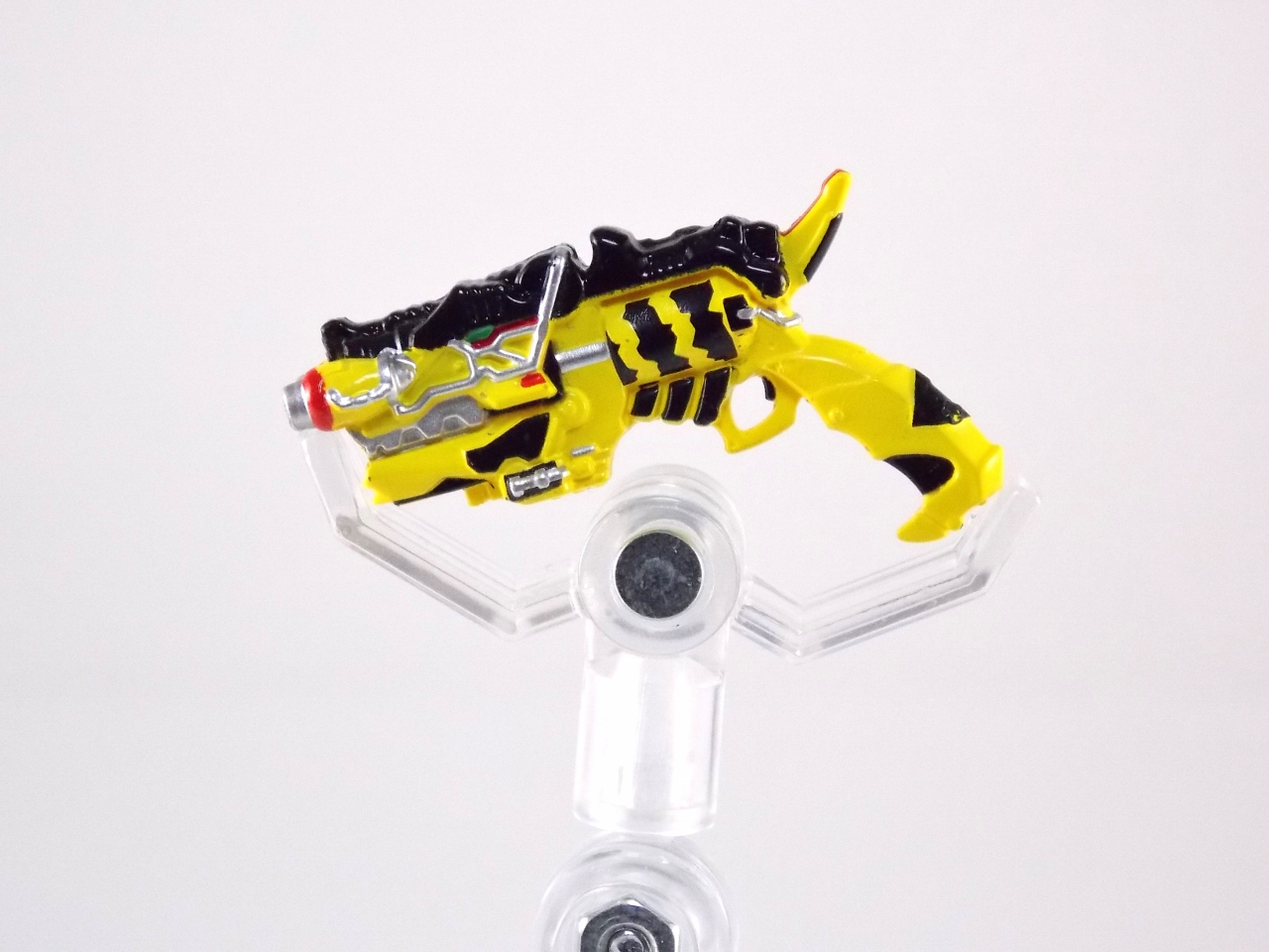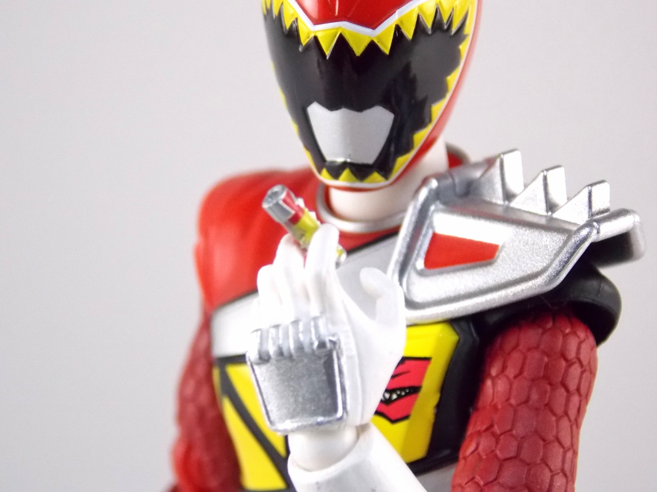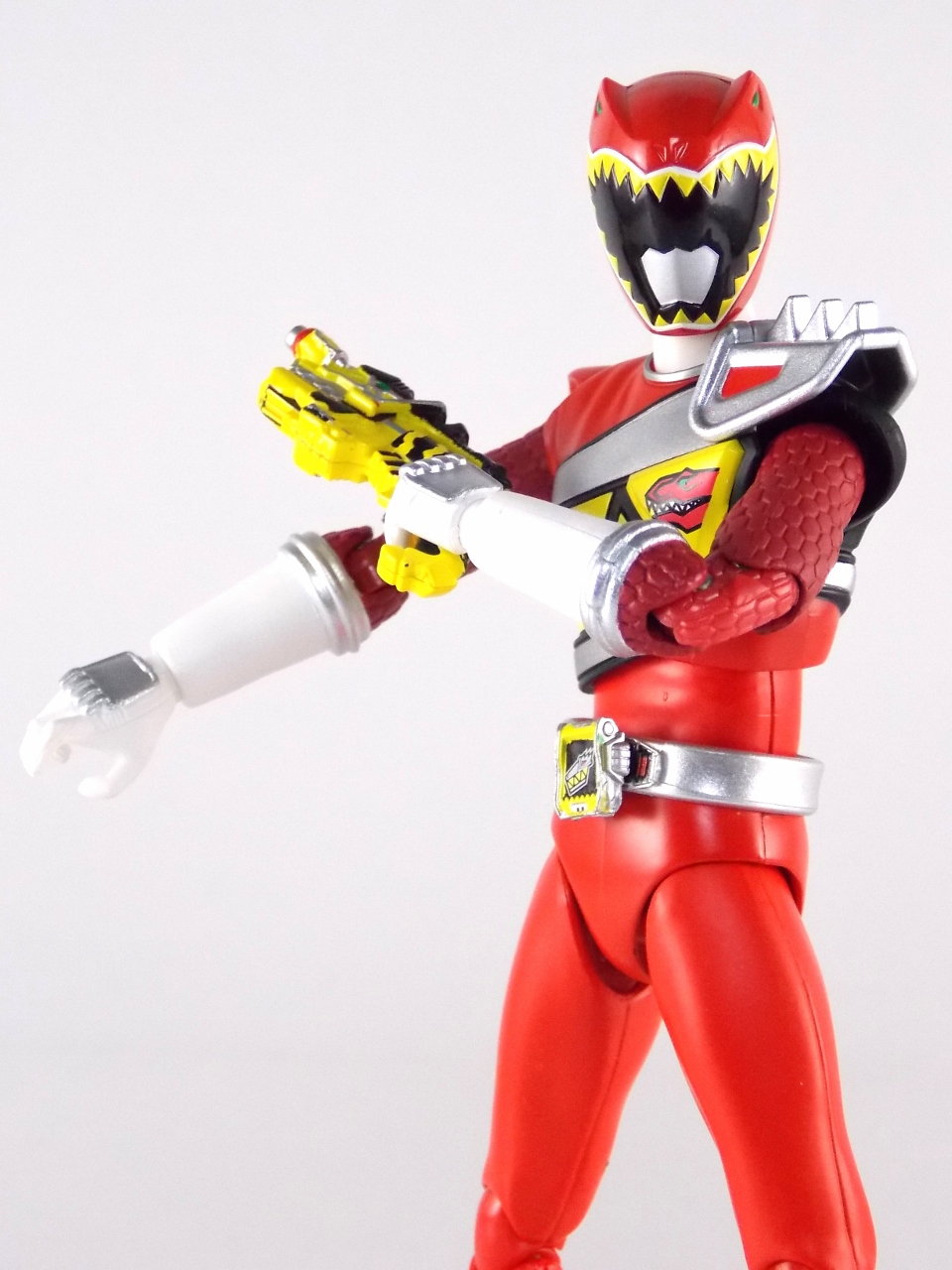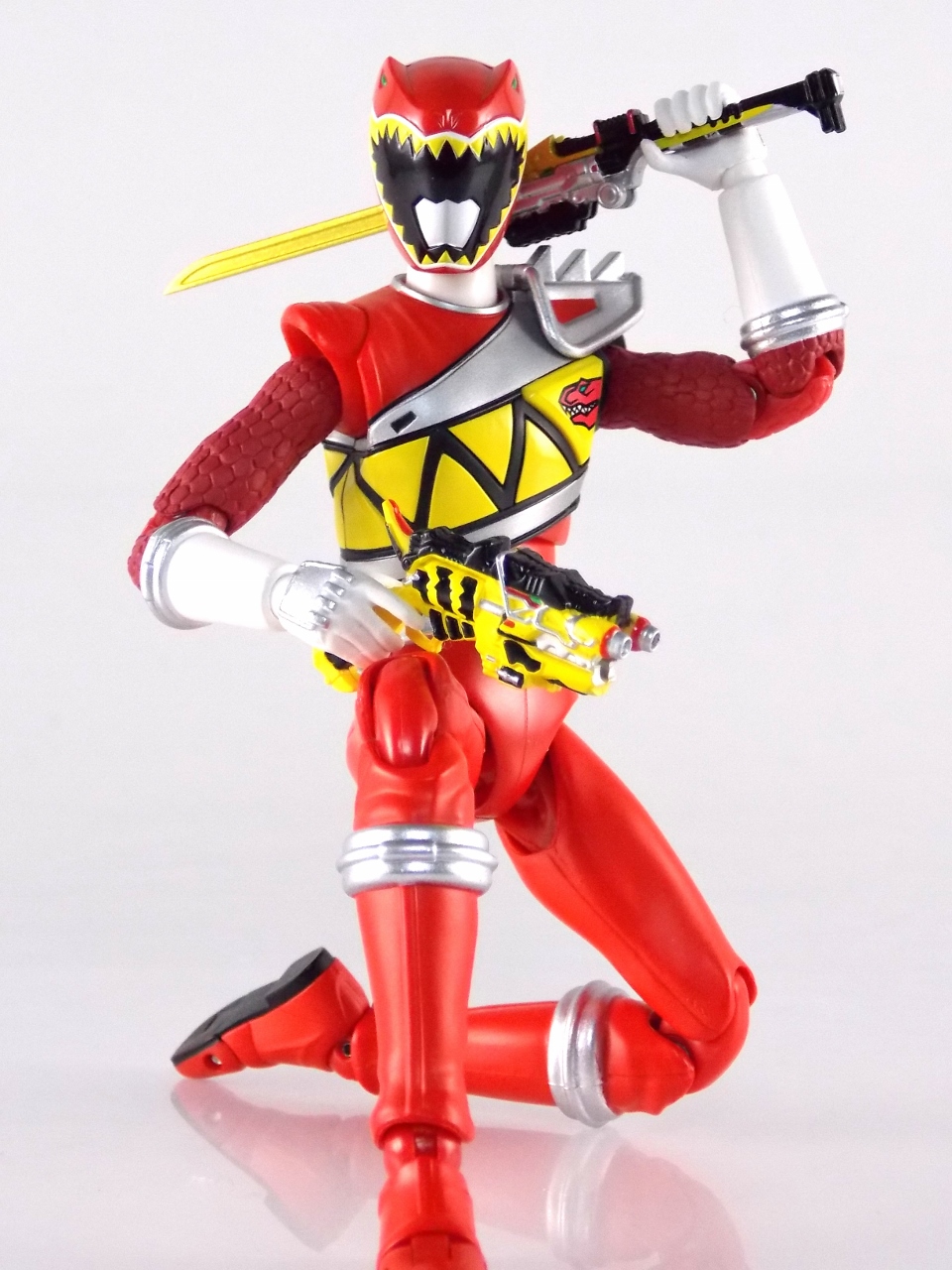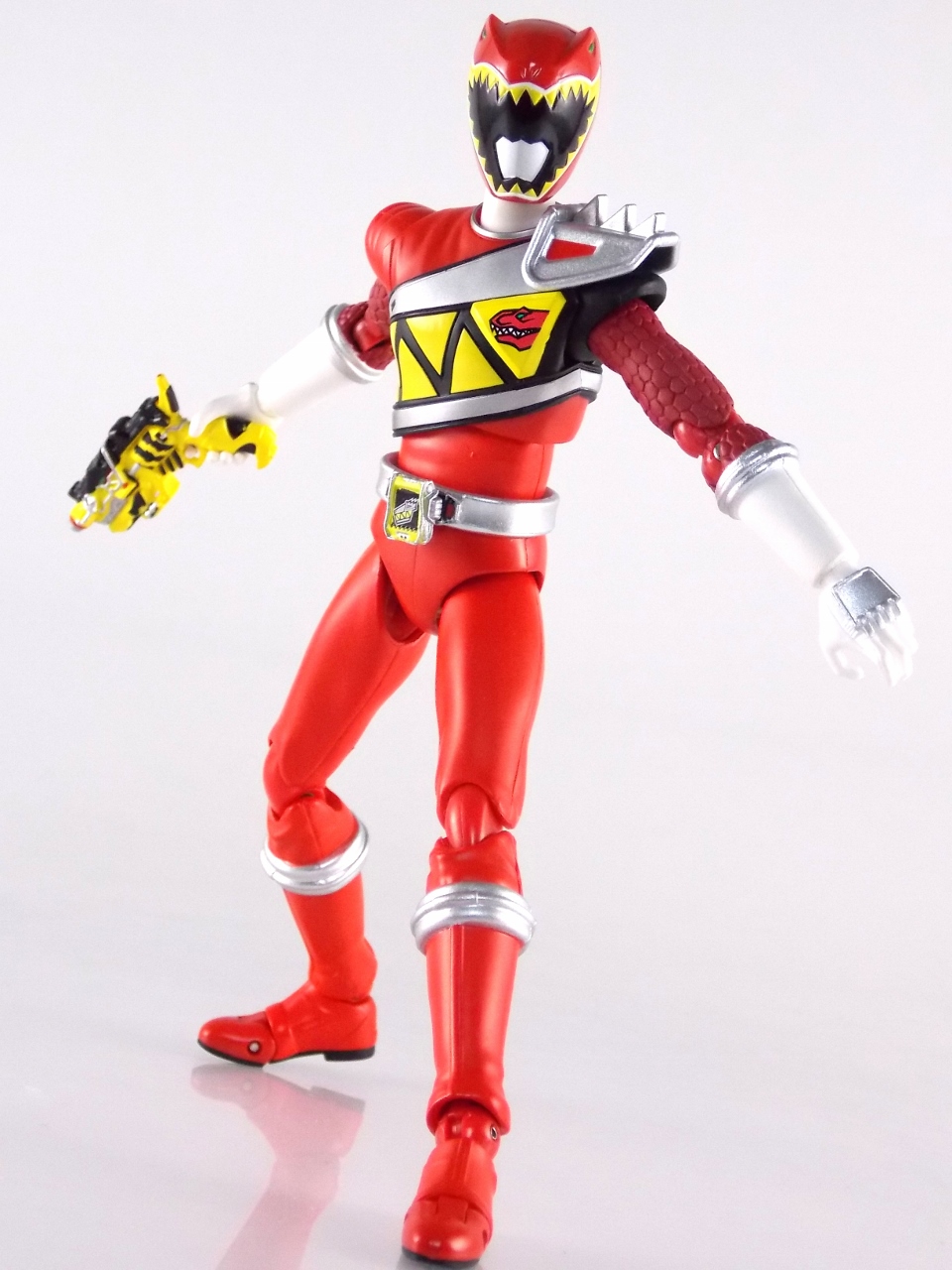 A renewed gallery for a new year! It's time for TokuNation to take it's Gallery 2.0 do-overs to the next level! Taking a look back at our archive of old galleries we thought that with the premiere of Power Rangers Dino Charge upon us it would be the opportune time to go back and give Zyuden Sentai Kyoryuger the TLC it deserves. So without further delay we now present S.H. Figuarts Kyoryu Red (Gallery 2.0)! Packaging Kyoryu Red comes in quite the interesting box. Though Sentai Figuarts haven't been around nearly as longs as Rider ones, they initially started out with the same boring box design. But in recent years Bandai's really gone all out, Kyoryuger figuarts are no different. Not just a simple window box, Kyoryu Red's really tries to evoke the general look and feel of his costume, right down to the "sash" across the window. The back of the box is also pretty snazy to just be a selection of stock photos. I mean honestly the Kyoryuger Boxes were some of the nicest sentai figuarts packaging for their time. Main Figure As with any time a new Sentai Figuart is release, Kyoryu Red is an entirely new base body. And wow what a nice one it is. The Kyoryuger designs are some of the more busy modern sentai suits we've had in a while, and I mean that in a good way. Luckily the busyness, in fact the more armored nature of this costume, lends itself that much more to being a toy. Where Riders Metal Heroes & the like have the advantage of armored costumes and less apparent articulation cuts, sentai costumes are basically fabric. So reproducing that in articulated toy form can be difficult. But Kyoryu Red really pulls off his look quite well. The lower half of the body is simple stuff. Come up to the belt though and look at the glorious detail on the Mobuckle. It's hard to see at that scale but the Kyoryuger emblem and even the eyes on the sides of the buckle are fully painted. The Mobuckle can also rotate to the side to simulate what happens when a Zyudenchi would normally be removed from inside. At this scale though they couldn't engineer the Mobuckle to open and store them. But that's okay as the included Zyudenchi is tiny. Further up brings us to the exquisitely molded arm details. Rather than go for a fishnet style paint job on the arms to get the scaly feel of the costume, Bandai has instead sculpted the detailing into the arms themselves! Thus creating a much more polished look that works better than I ever thought it would. The chest and head though are where the figure knocks it out of the park. As I said the more armored nature of the figure lends itself well to the toy makeover. The chest emblem, sash, shoulder, & back are all gloriously detailed and fully painted. The Gabutyra emblem in particular looks great. The head while well sculpted could stand to be painted just a little bit better. The front and back halves of it appear to actually be different colors under the right light. A minor gripe but one none the less. Otherwise it's dead on the show suit. And as for posability, well see for yourself below. Kyoryu Red can assume any of his iconic poses with ease and pretty great balance as well. The shoulder armor doesn't impact articulation either thanks to the hinge on the pad. So this guy has great open ranges of movement at his disposal. Accessories Kyoryu Red comes loaded down with a basically perfect assortment of what you need: 1 - Gaburevolver. The trademark weapon/henshin device of the Kyoryugers is done true justice here. You'd think at this size it would be missing paint apps but frankly it's perfect. It's just incredible how perfectly to scale this thing is painted compared to the real thing. Now the barrel doesn't spin nor can it open up on the end to accept Zyudenchi, but considering how small the Zyudenchi for these figuarts are that's fine. Once you got one in I'm sure it would never come out again. 1 - Generic Zyudenchi. Though by association this should be Gabutyra's Zyudenchi, it simply isn't painted correctly. Though to be fair none of the 6 Kyoryuger Figuarts have Zyudenchi with entirely accurate colors. But that's mostly because at this scale it's nigh impossible to paint properly. So some general colors are slapped on so you get a feel for it. Again this thing is infinitesimally small and I won't use it for anything again ever. I'm fine with it being kind of generic. 1 - Gaburicalibur. Again this is a wonderfully detailed piece. Right down to the most minor details this is a perfect recreation of the show prop. Again it does not open or accept batteries and I'm totally okay with that. What I'm not okay with however is that the Gaburevolver & Gaburicalibu do not combine into the Gaburicannon. Nor is a separately molded version of it included with any figuart. If a Kyoryu Violet is ever made it would almost certainly come with him/her as it was used quite often by the second (female) Violet. 3 - sets of additional hands. For your general needs. You get one set of Revolver hands, one set of Calibur hands, and one set of splayed out roll call pose hands. 1 - Armed On Arm. A great inclusion here is the option to display your figure as Kyoryu Red Armed On. To use this you need to (pretty forcefully) yank out his right arm at the shoulder socket. Then plug this one on. I've found this to be infuriatingly difficult to do with. Most of the time I can get it more or less on but can't always get that last "click" to lock it into place. But when you do, and then the arm stays up properly, the look is very satisfying. 1 - Gabutyra Fang. A complimentary piece to the Armed On Arm, the Gabutyra Fang is Kyoryu Red's Armed On weapon. Another beautifully, almost cartoonishly, sculpted piece that looks like it walked right off the set. It fully replaces the fist of the arm you plug it onto but it shoulder primarily be used on the the right Armed Arm. The jaw opens and closes and is on a nice tight joint so you can display it open if you so choose. While this Fang can't combine with the 