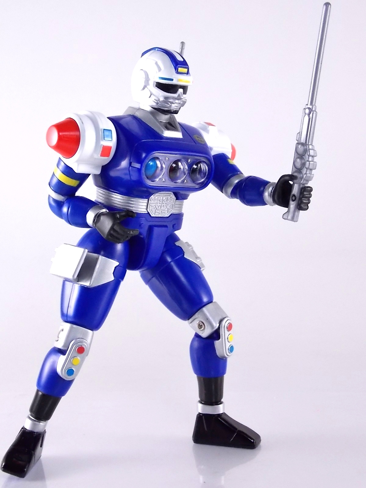 Well today, 5/17/15 is the 18th anniversary of the 1st appearance of the Blue Senturion in the Power RangersTurbo episode, The Millenium Message! In honor of that appearance we've decided to bring you a gallery of Quick Draw Action Blue Senturion figure! Packaging Quick Draw Action Blue Senturion comes on the same standard type of card back as the rest of the 5" Power Rangers Turbo toyline. Take a look waaaaay back at my Turbo Shifter Phantom Ranger gallery from last year for a look at similar packaging. It's got the usual show call outs and crossells for other figures. The funniest being the Chromite figure. The generic grunt villains of Carranger (Wumpers as they were knoww) went mostly unused for the Turbo adaptation save for a handful of episodes and that toy. Interestingly enough the color variety advertised is one that appeared in neither version of the show footage. Oddly enough the front of the package also mentions the "Key Double Action" feature of Blue Senturion, but the advertisement on the back doesn't actually list Senturion with the other ranger figures in this line. And he's specifically labeled on his own packaging as "Quick Draw Action". Little paradoxes like this however are very very common in 90's power rangers lines. Main Figure As a toy of the mid 90's Blue Senturion actually shows his age quite a bit. Looking at the basic figure there's a modest amount of detail here that you don't often see on figures of this nature though. A little upscaled from the standard 5" size this Blue Senturion has quite a number of paint apps, the helmet, shins, and even the small insignia on his upper chest go a long way to making an otherwise bland figure at least look decent. Where Senturion may have paint though, he lacks severely in proper articulation. Blue Senturion's lower body is limited to movement at the hips and at the knees. The hips rotate forward/back and have some outward mobility, but sadly the entire lower leg from the knee down is one piece. Add to this the feet permanently molded in an outward facing position and you can't really get anything too dynamic out of him. The arms are pretty funky too though. The left is on a pretty strongly clicking ratchet joint that only allows for upward/downward movements. No outward motion at all, no elbow, no wrist. The right arm however is hindered more, by the figures previously noted Key Double Action gimmick. This arm is molded in a reaching position that would make it appear to be constantly hovering over the hip holster. When the dial on the figure's back is turned either manually or by the included Key, not only will the 3 signals in his chest change, but the arm will spring up. Not a terrible gimmick but one that's detrimental to the toys capabilities. And that's that on the basic figure, the head and waist have no movement at all. Overall you just can't get much out of him. And you have to be careful as I discovered this figure is quite fragile. My Blue Senturion's left leg snapped right off at the knee. Apparently that lower part of the legs is cast in clear plastic and painted over making them incredibly fragile. I was able to make a quick fix to finish the gallery but be wary. Mine was brand new off the card and it still happened. Accessories Most of Blue Senturion's accessories consists of 3 versions of one item: 1 - Senturion Synergizer. This is the basic un-transformed version of the Synergizer as it would normally be held in his holster. Though for some reason it really doesn't seem to be designed to fit in the holster. It can be held though in either hand. 1 - Synergizer Blaster. As the name implies the Synergizer transformed in it's handheld blaster form. This one actually fits perfectly into the holster and is clearly what the figure's been designed for, though it's not as though the "quick draw" aspect of the toy can be applied. The hand can't reach that far down to grab it and initiate the gimmick. 1 - Synergizer Baton. As the name implies the Synergizer transformed in it's handheld baton form. This one works with the holster though it looks pretty silly when stored there. 1 - Double Action Key. This vaguely car themed item is meant to be sued with the slot on Senturion's back to activate the signal changing gimmick in his chest. Though its pretty unnecessary since you can turn the back dial manually as well. Otherwise it serves no other purpose. All in all not a bad selection of accessories. Each of the 3 versions of the Syergizer shares the same generic peg hole as the rest of the weapons in the line. Allowing for any Turbo or similarly styled figure to hold them. And likewise Senturion can hold other compatible figures weapons. Sadly they aren't painted at all though, but that's to be expected of a figure that's nearly 20 years old. Final Thoughts While by no means perfect, the Quick Draw Action Blue Senturion figure is by far the one decent representation of this character in toy form. Though there is a larger 8" scale figure, most wide ranger toy lines & collection run in that 5-6" scale so this one really is unique. It's wholly unique in fact to the US Turbo toyline, a figure created just for it. Tie character that Blue Senturion is based on from Gekisou Sentai Carranger, the appropriately named Signalman, only received a figure in a vehicle 2-pack with his bike. And neither version of the character has ever had any sort of collector's style toy produced of them and likely won't for some time. At the very least this figure is a decent enough stand in for the time being. I was able to pick this one up for about $25 at a recent local toy convention and for that price it's more than worth it to have him hanging out with my Phantom Ranger/VRV Master.