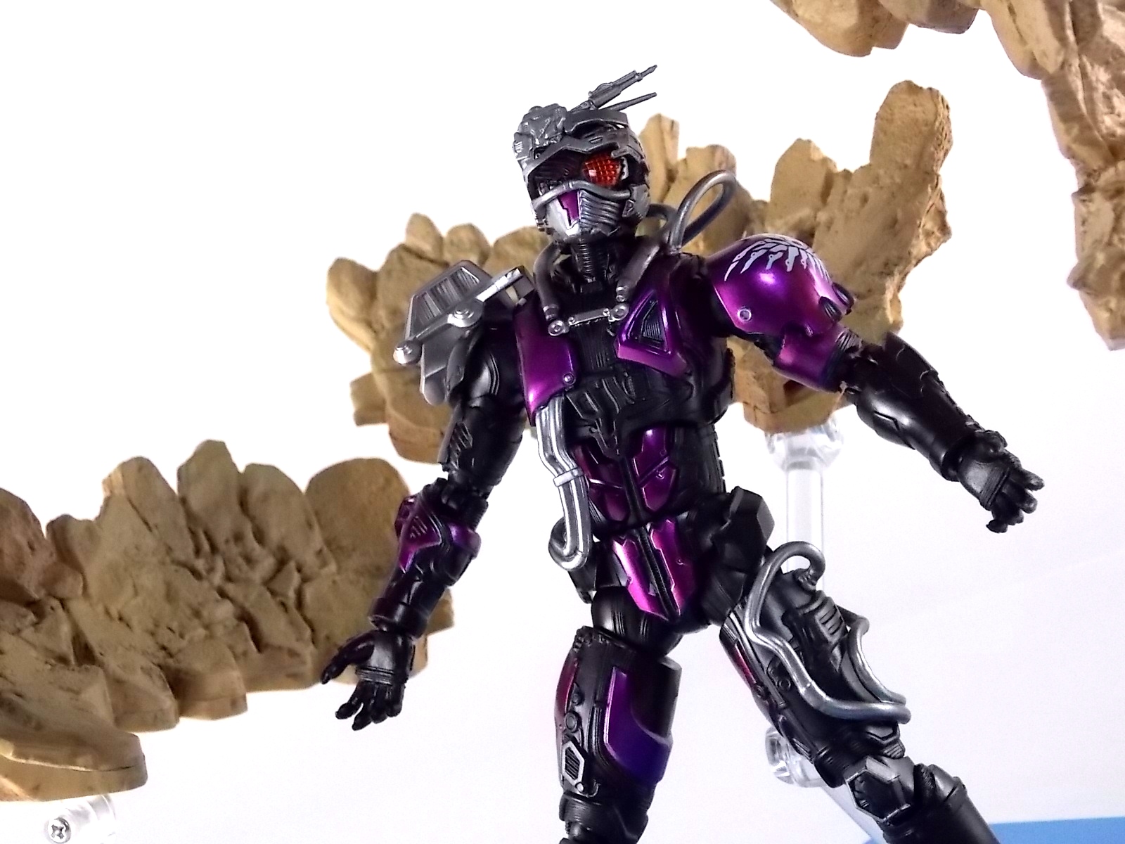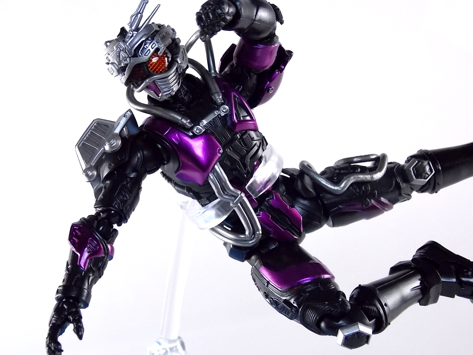 Cue the wicked guitar in the background because an incredible figure is officially in the foreground! Having debuted all the way back in Kamen Rider Drive episode 3, the one and only grim reaper of the Roidmudes is finally brought to life in collectors' toy form as S.H. Figuarts Mashin Chaser! Packaging S.H. Figuarts Mashin Chaser has followed the lead of Drive Type Speed and other recent releases and gone with a slim style box. Seemingly the new standard for mass retail and even some exclusives going forward, I have little new to say about it. As with Drive the theme of this season carries over well to the new box and it's decorated with some very awesome Mashin Chaser artwork. Aside from that and some stock photos of the figure, there's nothing new to report. Main Figure The bulk of this review consists of Mashin Chaser himself, we'll break down accessories a little further below. Chaser is a brand new mold in this fledgling line. If there's any parts sharing with Drive, it's definitely not apparent. But given Mashin Chaser's incredible asymmetry he should be his own unique beast. While Mashin Chaser looks gorgeous let's get something out of the way right now, he doesn't feature a ton of paint apps. Because he doesn't need them. The base figure is primarily black as he should be. Armored components are painted both metallic purple and silver where necessary and the grey piping on his body is molded in the appropriate color from the outset. So while Chaser may not seem to have as many paint applications as other Figuarts, the details are all present. Back to the asymmetry though, Mashin Chaser is probably one of the more elaborately molded Figuarts ever. Each thigh is unique, both forearms, both shoulders, his chest, head, everything really. While Drive was asymmetrical for different reasons he now seems very much more neat and orderly compared to Chaser. Mashin Chaser is really the embodiment of chaotic elements here compared to Drive. And thankfully the sculpt of the figure has capture this perfectly. The head is by far the most interesting part of the figure. There's just so much techincal detailing put into it that it's astounding. There's a bit of a gap issue through the middle of the head on mine, but otherwise it's fantastic. And those eyes, just some of the best compound eyes I've seen on a rider figuart in recent memory. By the way those tubes I mentioned above? They're made of an awesomely flexible plastic so you're much less likely to break them. And awesomely they don't impact the figure's range of motion at all. Because of the way the torso tubes are connected to Chaser they run the length of his torso and down to his waist but loop back up and attach to his back. So you don't have a rigid connection to the waist that would hinder movement. Sadly there are 2 things that hinder the arms. The shoulders. Though Mashin Chaser really does have a full range of motion, his shoulders are poorly designed. Though both have ball jointed pads on them the way the shoulders are designed prevents you from lifting the arms up and fully out perpendicular to the body. The shoulders can be pulled down and out but when you try to gend them back and up the sheath around the shoulder impacts the torso. Rather than being able to put his arms in a 90 degree angle you get more of about 80 degrees. So it's a bit hard to create iconic poses with the Break Gunner out to the side. The head is also unencumbered by the pipes on the shoulders, though the collar around the neck can be a pain. Otherwise the figure is incredibly solid, though I have one minor complaint about his back that I describe below in the Tire section. Accessories The pickings are a little slim, unless you ordered the 1st release of Mashin Chaser with the 1st run bonus! 1 - Brake Gunner. The trademark weapon of Mashin Chaser, the Break Gunner is scaled down to perfection here. While it's non-functional in the sense that it doesn't have moving parts, the guard on top can be removed to reveal a plug for Shift Cars! So any of Drive's standard non-flipped shift cars can be stolen or "tuned" by Chaser. Though the other half of tuning doesn't quite pan out, see Midnight Shadow Tire below. 3 - Sets of additional hands. Pretty standard fare here. Open hands for menacing stuff, one set to hold the Break Gunner in either hand, and a set of bike riding hands! These are a seriously welcome inclusion as many modern figuarts generally don't include them right off the bat. 1st Run Bonus 1 - Midnight Shadow Tire. Much like the Max Flare Tire the Midnight Shadow Tire, like all others in this line, can break apart into several component. The front and back halves can be clipped onto Kamen Rider Drive's chest or another compatible future release. This allows for a damn near seamless high end version of the Tire Koukan gimmick. The Hub section has a peg hole on the back of it that yes conveniently works with tamashii stage arms, but moreover it's meant to let the tires be used by the upcoming Tridoron! The paint on Midnight Shadow is pretty hit or miss though. It's a really thick grainy paint that they went with, not glossy at all and it feels quite cheap. And sadly it's poorly applied on several parts of my Tire. Connection points are also painted in this way so I'm sure it will flake off with repeated use. Sadly however Mashin Chaser is incomparable with the Tires as is. There is a removable plug on his back that exposes a port for his upcoming Busou Chaser set, but there's no such connector to use with any of Drive's Tires currently. Unless a part is included with that set. For now I've come up with a quick and dirty solution to at least get the general look of the Tire on Chaser's back. It involves you having an extra Tamashii Stage part but it works quite well. See the images below for a quick how to. 1 - Flipped Midnight Shadow Shift Car. Just like Max Flare, a flipped version for Drive's Shift Brace. 1 - Mr. Belt Shadow read out. Also just as the 