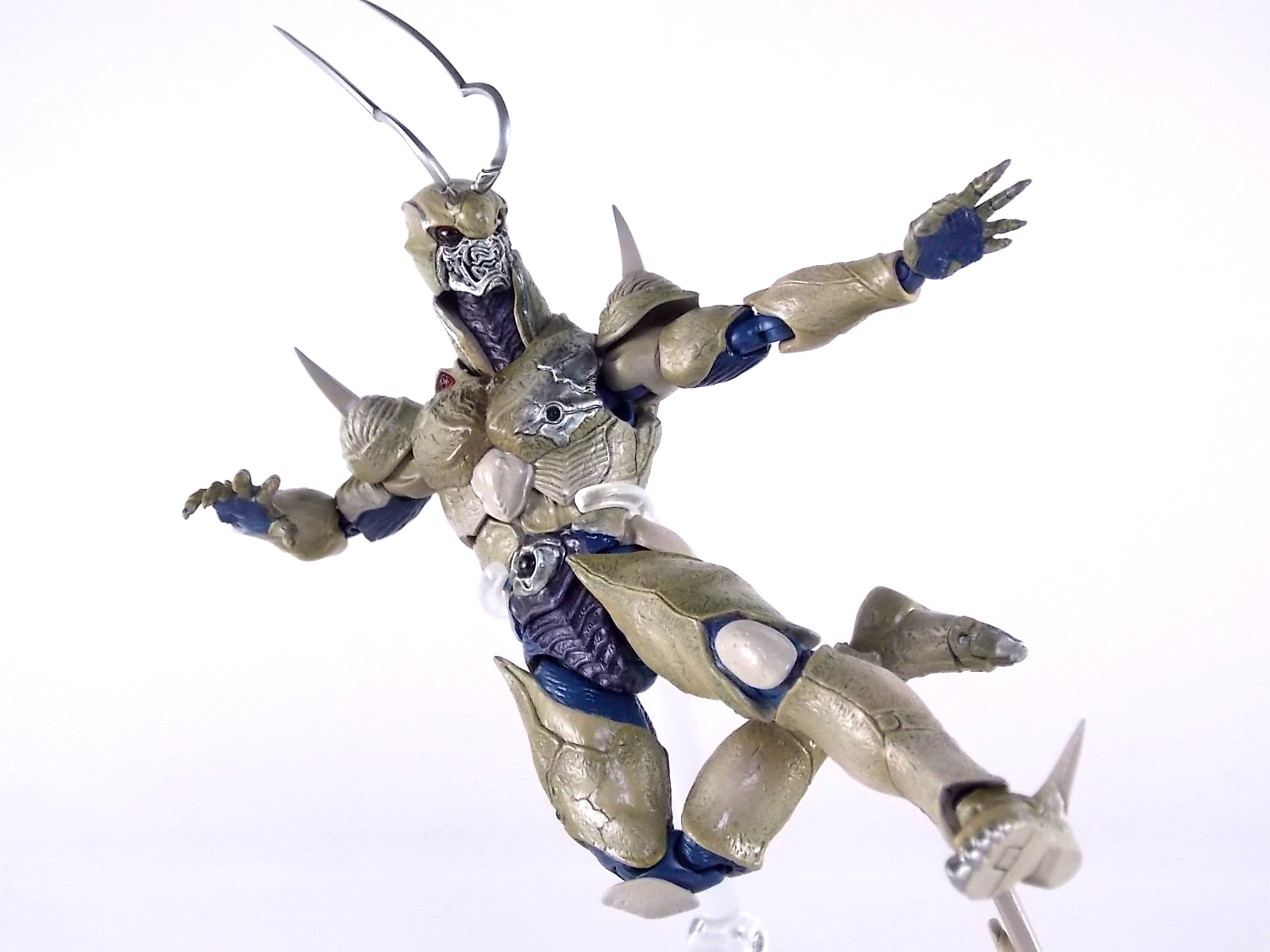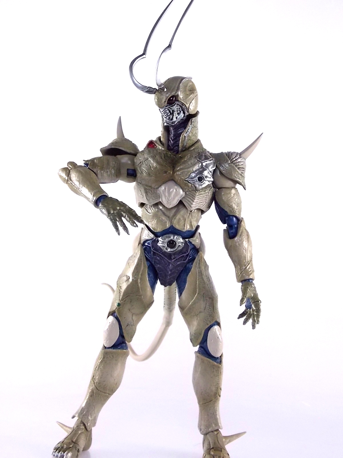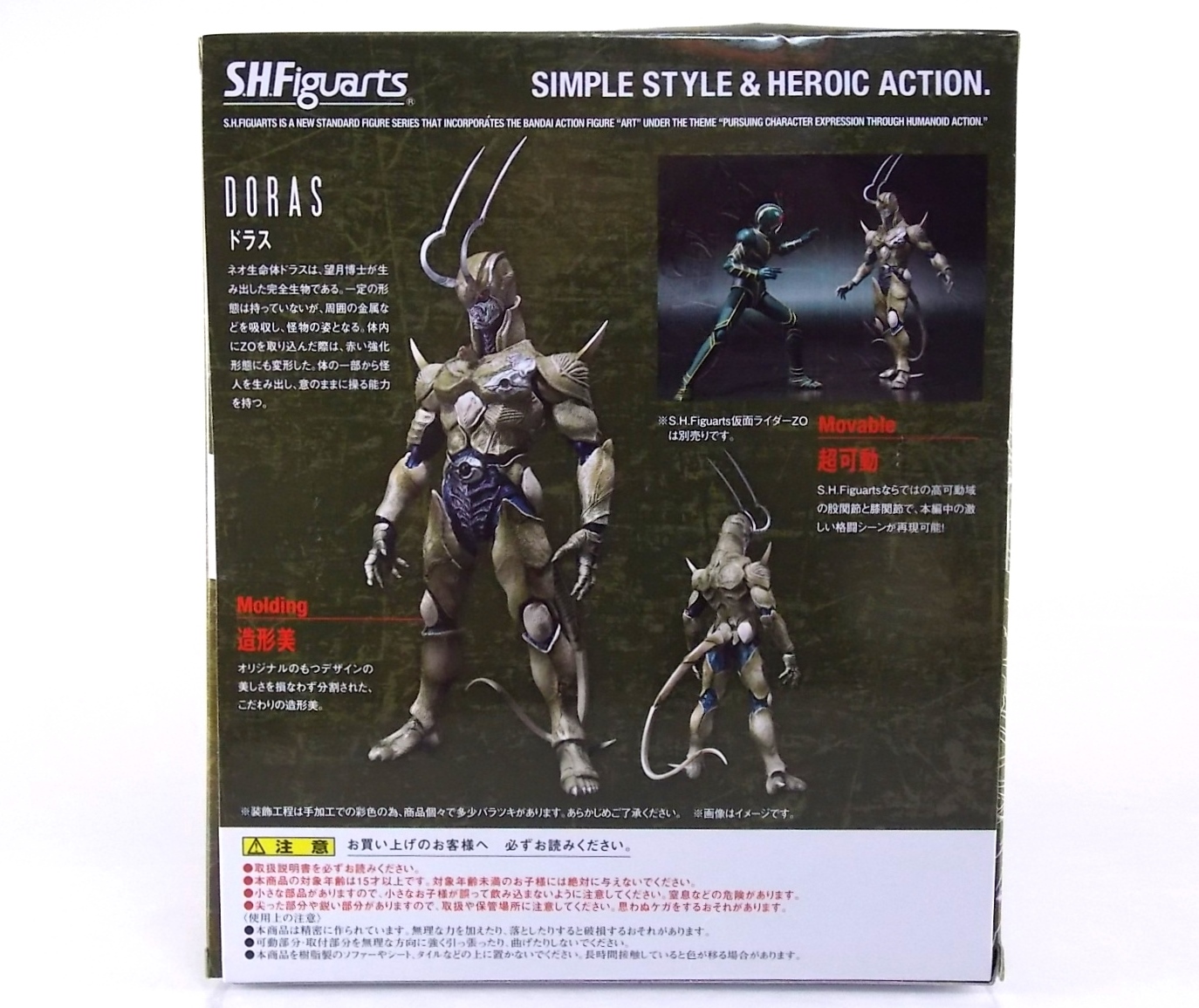 Originally created from the Neo Organism that Professor Motchizuki unleashed on the world, Doras came to exist in the Kamen Rider ZO movie. Yet another film created to celebrate the 20th anniversary of the Kamen Rider franchise, as well as a new beginning of sorts. With the critical failure of it's predecessor, Shin Kamen Rider, ZO became the new de facto modern rider for a brief time. Though Shin, ZO, & later Kamen Rider J comprise a special trio of movies and riders that later came to be associated with the Showa era, they were entirely produced in the early Heisei era. ZO was meant to be the new modern day Rider 1 while J who purposefully shared a similar design, was meant to thematically be his Rider 2. However Doras technically predates both of these heroes. Although ZO is referred to by the Professor as Cyborg #1 the Neo Organism he's been incubating is the first in a new breed of cybernetic Organism. When it matured it created Doras as it's avatar in the world. In effect Doras is more of a tool than character, and in fact is very pseudo-rider like. Though he doesn't transform he shares many design cues as riders and almost appears to be an even more monstrous version of Kamen Rider Shin. The character would appear many years later in the 2010 Decade/W movie wars first in it's initial form and then later in a more dangerous & evolved state. Packaging It's been some time since I ran across some Tamashii Web Exclusive packaging that wowed me, but finally the good stuff is back! Though I still don't have much to say, I absolutely love the line art created for releases like this. This box, much like the figure, is very reminiscent of Kamen Rider Shin from a design perspective. With an almost wire-frame version of the character on the front and spine and a good selection of stock photos on the back, what more could you ask for? Well a special clam shell within the plastic tray designed specifically to protect Doras' wonderful antennae! Main Figure I've really only ever said this once before about a figuart, but I'm prepared to say it again. This figures is absolutely monstrous and gorgeous. S.H. Figuarts Doras is a prime example of how wonderful sculpting and paint can transform what would otherwise be a limited run toy of a rather obscure character, into a masterpiece. Kamen Rider Shin was the same way, though he was solely organic unlike Doras who features numerous technological details on his body. The primary thing you'll notice is that Doras is almost entirely asymmetrical. Head to to toe, if you cut him down the middle the 2 halves would be very different. It brings to life the interesting premise that Doras' body was originally crafted from junkyard scrap metal. A true cyborg fusion of details. The belt area and chest features some of the most detailed sculpting. Though it must be pointed out despite how good he looks, that Doras is not entirely accurate to the suit used in the film. While A very good representation of Doras, the Figuart can't quite capture the changing details of the actual suit. Several versions of it were used through out the film with varying degrees of weathering and detailing that are hard to replicate in figure form. Though I believe this figure has done and admirable job of doing so and is likely the most accurate representation of Doras ever. The head itself is a marvel of detailing and paint wash, I only wish the mandibles could open, or that there were an alternate head included to simulate it. The truly terrifying moments with this character are when he's trying to consume Kamen Rider ZO. You should also be aware that Doras' gigantic antennae are very fragile, as are the various spikes on his appendages. The instructions go out of their way to warn you to be careful with these areas. Regardless the figure is incredibly solid, with some of the most sturdy flat feet I've ever seen. Great balance all around. Though sadly the hips leave much to be desired. The spiked hip armor impacts the waist keeping the legs rather restrained, its a design flaw for the toy but the look of the legs at least is accurate. This issue aside everything else is wonderfully articulated. shoulders, double neck joints, great ab crunch and floating upper torso. If the legs were just a bit better we'd be in serious business. Overall though S.H. Figuarts Doras is a beautiful figure with some seriously nice details. He'll fit right into anyone's collection. It makes me very very hopeful that one day we'll see the Decade version of the character brought to life as well, or perhaps some of the S.I.C. Hero Saga versions of the Doras done up in S.H. Figuarts. Time will tell! Accessories Like many Web Exclusives Doras is rather lacking in the accessories department. It includes: 1 - alternate extended tail. This piece can be used by unplugging the small tail stump from his back. They're both on ball joints so the swap is quite easy. I am disappointed though that the tail doesn't have at least one pivoting joint for some kind of posing. You have to rely entirely on the ball joint at the base to get movement out of it. 2 - sets of hands. Sadly these are 2 very same-y sets of hands. Splayed open ones and then splayed even more open ones. They're just repetitious. One set over the other in favor of another accessory of some sort would have been better. Usually I don't have a ton of suggestions for accessories that should be included with something. But here there's plenty of room for improvement. Doras is lite on the goodies but wow there are tons of options for things they could have included. A replica of his small orb like form, or of the later liquid metal form he assumes for rapid travel. An alternate torso with his chest open to simulate how he tries to kill ZO initially. A replaceable right arm and left leg with mechanical bits. The aforementioned alternate head with open mandibles. I mean come on those are obvious based on his regenerative abilities. It really saddens me that none of
