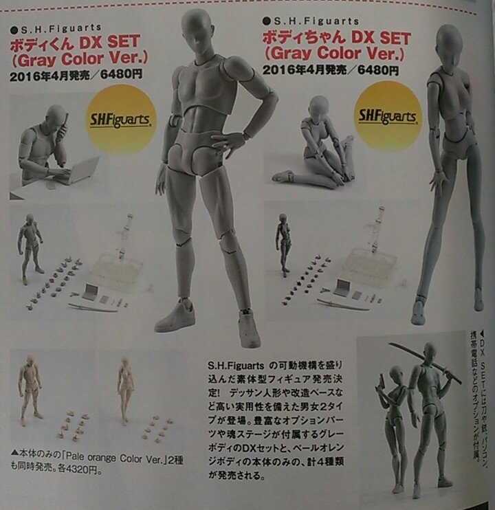 S.H. Figuarts Blank Body Gray Color DX sets Both Male & Female versions Either of the 2 Gray sets is 6480 yen each. They each include the same accessories: - 17 hands - a pistol - a laptop - a kitana - open/closed cellphones - a book - a knife - and a deluxe Tamasii Stage with parts storage for the extra hands! S.H. Figuarts Blank Body Pale Orange Color Version Both Male & Female versions Either of the 2 Pale Orange Sets is 4320 yen Each includes the same accessories though less than the DX sets: - 8 hands