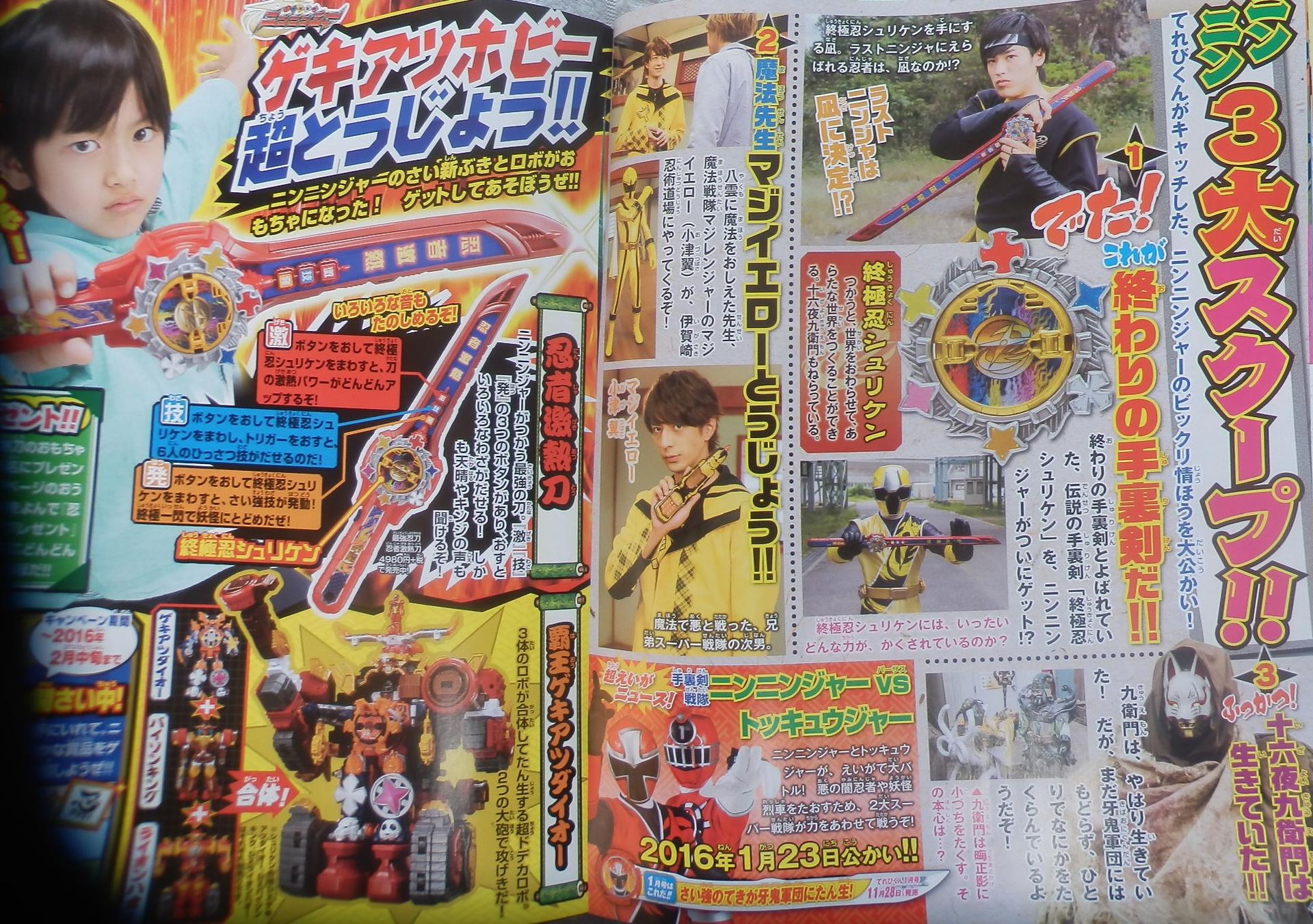 1. The Owari no Shuriken is finally revealed! The Owari no Shuriken everyone was clamoring about is called Shukyoku Ninshuriken or Ultimate Ninshuriken. And the scans say"Nagi is holding it, could it be that he is the last ninja?" 2. Magic Teacher visits the dojo Ozu Tsubasa aka Magi Yellow from Magiranger was the teacher who taught Yakumo magic. 3. Izayoi Kyuemon Lives Kyuemon is still alive and has yet to return to the Kibaoni army and seems to be plotting something on his own. They also point out that he left the small hammer to Masakage but do not know what hidden intentions lie deep within.