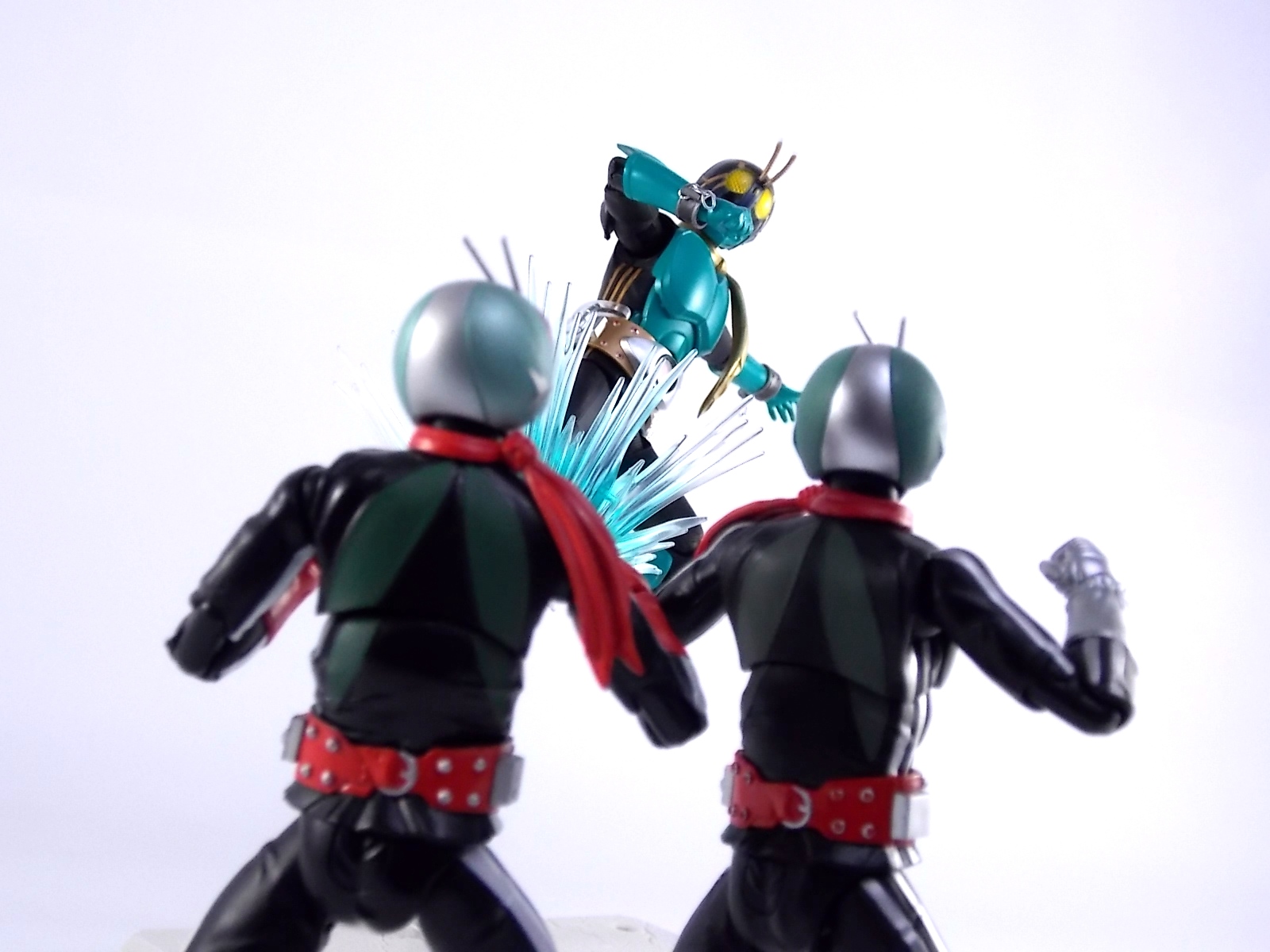 That guy is the forgotten hero of the Showa era, S.H. Figuarts Kamen Rider 3! This unique rider is not as you might first imagine, simply a new character created in the modern day. But is actually based upon one created by Shotaro Ishinimori himself in the 1972 Manga Kamen Rider 3 vs. General Black! Originally conceived as the successor to Rider's 1 & 2, Rider 3 was none other than Kazuya Taki, FBI Agent & ally to the Double Riders. Though this version of the character as rider only existed in this short 5-page manga as he was dropped in favor of Kamen Rider V3. The character would be largely forgotten for some 40+ years until 2015's Super Hero Taisen GP: Kamen Rider 3 in which a new updated version of the character was presented. Here, Rider 3 AKA Kyoichiro Kuroi, is created by Shocker with the aid of the Time-Altering Machine in order to change history. Arriving in 1972 shortly after Riders 1 & 2 have destroyed Gel-Shocker, Rider 3 savagely attacks and defeats both riders, ensuring Shocker's time altered control of the past present & future. However what Great Leader could have never imagined, was how the act of destroying the Double Riders and the guilt of that action would eventually reawaken Rider 3's heart to justice. Ultimately bringing the downfall of Shocker once more. ** The name is often romanized one of three ways like most numerically based rider names. "3", "3Go", or "Sango". For ease and consistency I'll just be using the term Rider 3. Packaging What you'll immediately notice about Rider 3's packaging is that even though he's meant to have Showa Rider lineage, it's actually in the style of a Kamen Rider Drive release! That makes sense considering his origin & appearances in Tasien GP, itself a primarily Drive focused film. It's unique to see a pseudo-Showa rider packed in a specific Heisei style of box none the less and it looks very good. But the box is primarily what we've come to expect from Drive themed releases. Many Rider releases come in these slim style boxes now, but Rider 3 specifically is designed around the Drive packaging type. Main Figure Ever since the first images of Rider 3 leaked from the film online I was impressed. This, for all intents and purposes, additional Showa Rider bore all the hallmarks of the time period, but with a modern twist. Specifically he's always appeared to me to be like a S.I.C Kamen Rider in physical form. The figure is no different in hand. Kamen Rider 3 is one of the most solid original molds released in years. A brand new figure, Rider 3 is entirely unique. Which is a bit odd given his nature as a one-off alternate time line movie villain/hero. This mold can't really be used for anyone else. But boy did they go all out on this one. Again Rider 3 seems to take cues from the S.I.C. toyline but also seems to draw inspiration from the Kamen Rider The First & The Next film designs. Hard angular lines and sharp edges adorn his body and build up his physique well beyond those of the aging Shin Rider 1 & Rider 2 figuarts seen below. I never felt the old riders showed their age much until this bad boy arrived. Now it's much more apparent. Each of Rider 3's ankles and wrists features a really nice detail you don't see often, and that's Shocker cuffs with actual metal links on the chains. Each cuff features the Shocker emblem and has a couple small links hanging off of them. A symbolic design feature to show his servitude to Shocker. This among other creative choices really sets Rider 3 apart from his Showa brothers. Like the very bright teal color of a majority of his armor, rather than the drab green of 1 & 2. Gold body stripes rather than white and a gold belt & scarf to go along with this. Uniquely Rider 3 also features yellow compound eyes that just look gorgeous in the right light. And that headsculpt is where it's at. Again, this component more than any other screams S.I.C. to me, in the best ways. The Rider 3 design is just a beautiful one to behold in any form and this figure is no different. Perhaps my only gripe with it would be that the hips can be a bit fidgety and hard to set in an even position with one another. I was surprised that the chest and torso have a fantastic range of motion as well despite the thick broad design. This is jut a solid figure. Accessories Rider 3 Actually has even more in common with his Showa brothers than you might think, specifically a mid-level accessory count: 6 - additional hands. The usual type of open expressive hands. No "holding things" or driving/riding hands at all. 1 - scarf/muffler. A nice golden brown to match his suit. 1 - Rider Kick Effect Part. In fact this is the exact same kick effect that Shin Rider 1 & Rider 2 (Ichigo/Nigo) came with. Some slight color differences give it a distinct teal flavor. But otherwise identical, the foot hole has been remolded slightly to accommodate Rider 3's new boot design. Though I find this effect to be difficult to use, it does look nice. Mine kept falling off his foot. 2- Typhoon Rocket Effect Parts. These smaller effects are meant to plug onto the tiny jets on either side of Rider 3's Typhoon belt. These simulate his limited flight capability, but they also serve as effects for his henshin poses. Honestly that's a pretty decent selection. As a retail release he feels a bit lite, but he really does come with just about anything he'd need at all. Everything that he used in the movie is here. Well other than, you know, other than that gigantic awesome car.... Final Thoughts As a whole package S.H. Figuarts Kamen Rider 3 is one of the more complete and solid releases I've handled for some time. It's a fantastic looking figure with just the right accessories to compliment it. He's a well designed and executed toy that really captures the look of his on screen counterpart. They've managed to take that wild modern design and shrink it down perfectly. And it fits in just perfectly with about any Showa or Heisei rider display as well. I'm a little bit sad 