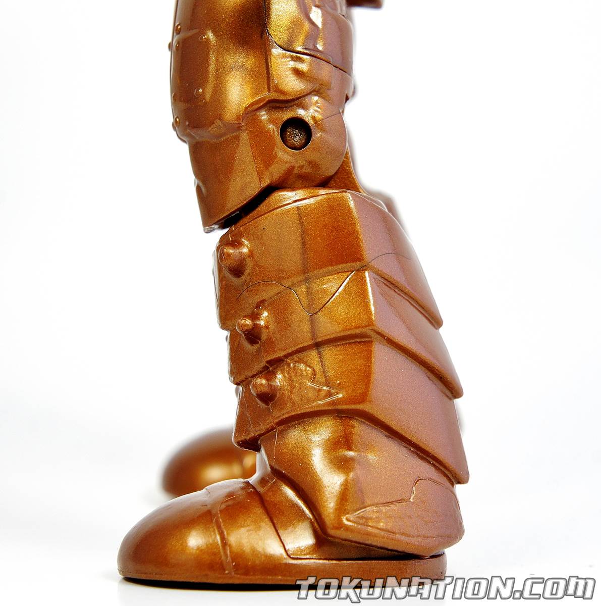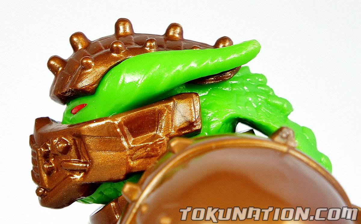 So how does the toy of the new Power Rangers-created villain stand up? Let's find out! The Figure This is another figure that features great articulation. You have the standard 13 points of articulation (head, 2 on each arm, forearms, 2 on each leg, knees), and my all time favorite part about this figure - his shoulders are designed NOT to hinder his arm articulation! The shoulder pads, as shown in one of the pictures, actually can pull back (they are attached further down his arm) which allows you to get some great poses with his arms that do not have the shoulder pads blocking your path. As always, the paint applications are weak, almost to the point that it ruins the figure. The armor is a bright rust orange instead of being a muted rust orange like in the show, and his skin is way too neon green (it should be a bit softer to match the show). So Sledge is very bright as a toy, none of his computer contraptions on his body are painted, and the backside of the figure (as standard in Bandai America releases) is not painted at all, almost ruining the majesticness of the sculpting of the figure. Sculpting wise he's pretty spot-on, and the added "cracks" and "dents" in his armor are a nice touch. He has scales on his arms (just like the show), and he even has detail on his "dreadlock tentacle" hair. Speaking of - that tentacle does stop some articulation on the head as you can't easily wrap the tentacle around his shoulders because they're so bulky. His legs also get hindered a bit because his waist is so huge. Overall, he feels heavy and bulky, with enough articulation that isn't hindered to make him feel like a pretty strong figure. The Accessories He comes with his blaster that fits in to a molded hole in his right wrist. Mine fits snugly but I've seen reports of others where the peg isn't large enough and thus it falls out constantly. The blaster itself is molded in the soft plastic and I assume the mold wasn't strong - I have a noticeable crack in the weapon from the plastic molding (see picture). The Good